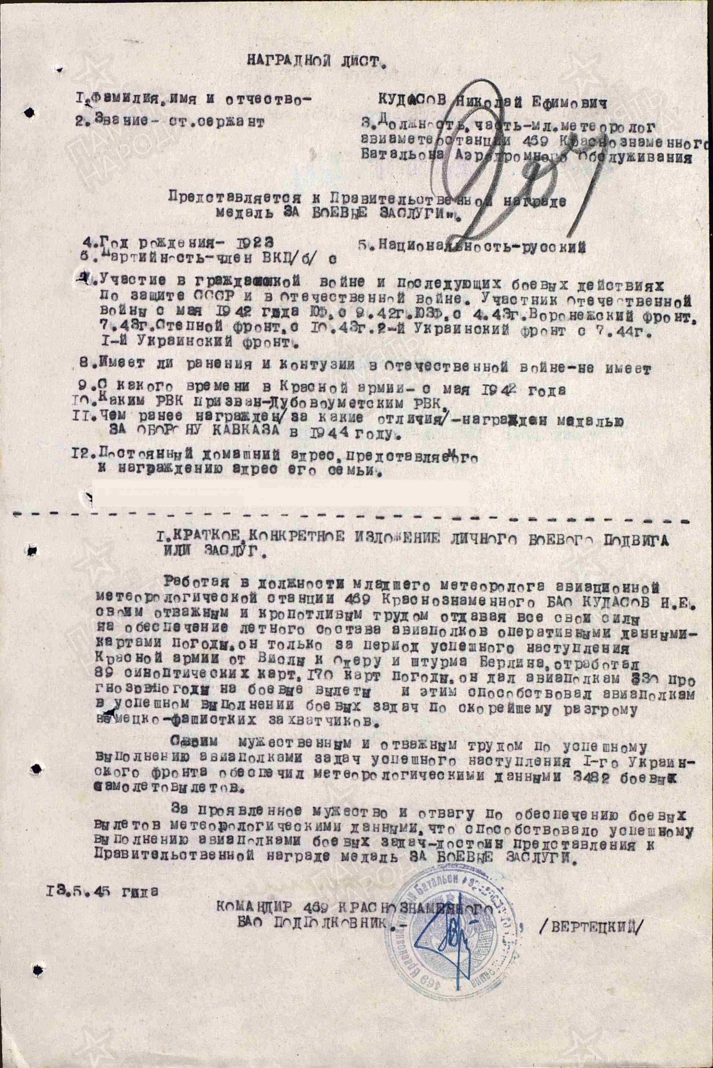 Я родился 26 мая 1923 года в крестьянской семье, в селе Дубовый Умёт. Отец – Кудасов Ефим Васильевич умел читать и писать. Мать – Наталья Яковлевна была безграмотная. Кроме меня в семье было три старших сестры и младший брат. Младшая сестра и брат участники Великой Отечественной войны. В 1931 году я поступил в Дубово – Умётскую школу колхозной молодёжи (ШКМ). В 1941 году сдал экзамены за 10 класс. 12 июля 1941 года призван в ряды Советской Армии. Сначала был направлен в артбазу, а затем оказался в Московской Краснознаменной военно-авиационной школе связи (МКВАШ). За шесть месяцев одолел двухгодичную программу и получил специальность метеоролога. Служил в батальоне аэродромного обслуживания во Второй воздушной армии. Часть участвовала в обороне Кавказа, за что была награждена орденом Красного Знамени, а личный состав медалями «За оборону Кавказа».