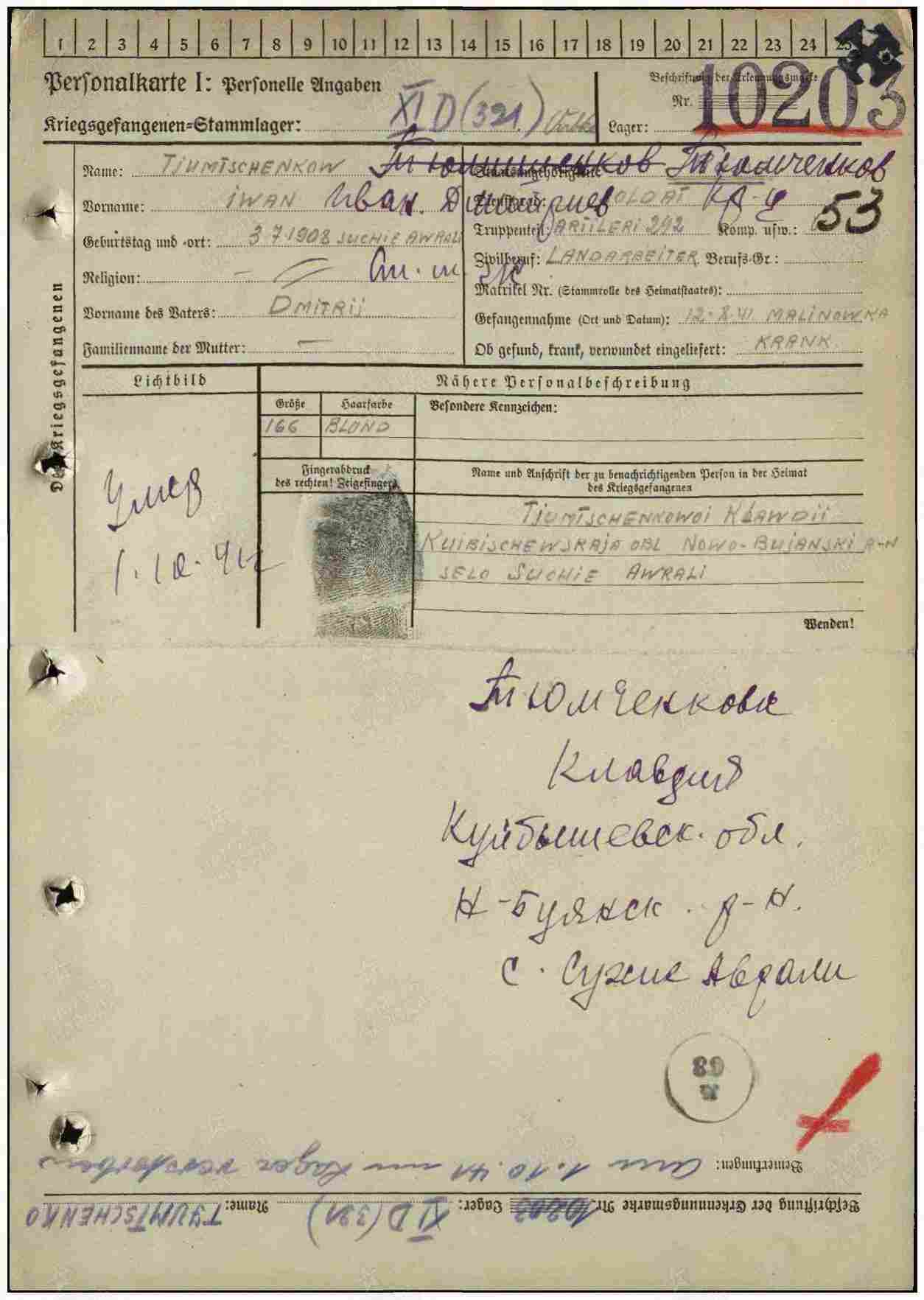 Из рассказа Ивана Ивановича Тюмченкова - сына Тюмченкова Ивана Дмитриевича: «По воспоминаниям мамы, перед началом войны отца отправили в Рязань учиться на дорожного мастера. Оттуда его и забрали на фронт. Через два дня после моего появления на свет, мама получила извещение о том, что отец попал в плен. Но уже в ноябре того же года нас известили, что Иван Дмитриевич Тюмченков числится в списках пропавших без вести. Спустя много лет я получил известие из Тамбовской области о том, что определено захоронение отца. Радость со слезами на глазах, да и не только на глазах. Мое сердце плакало от счастья» - говорит убеленный сединой сын погибшего солдата.