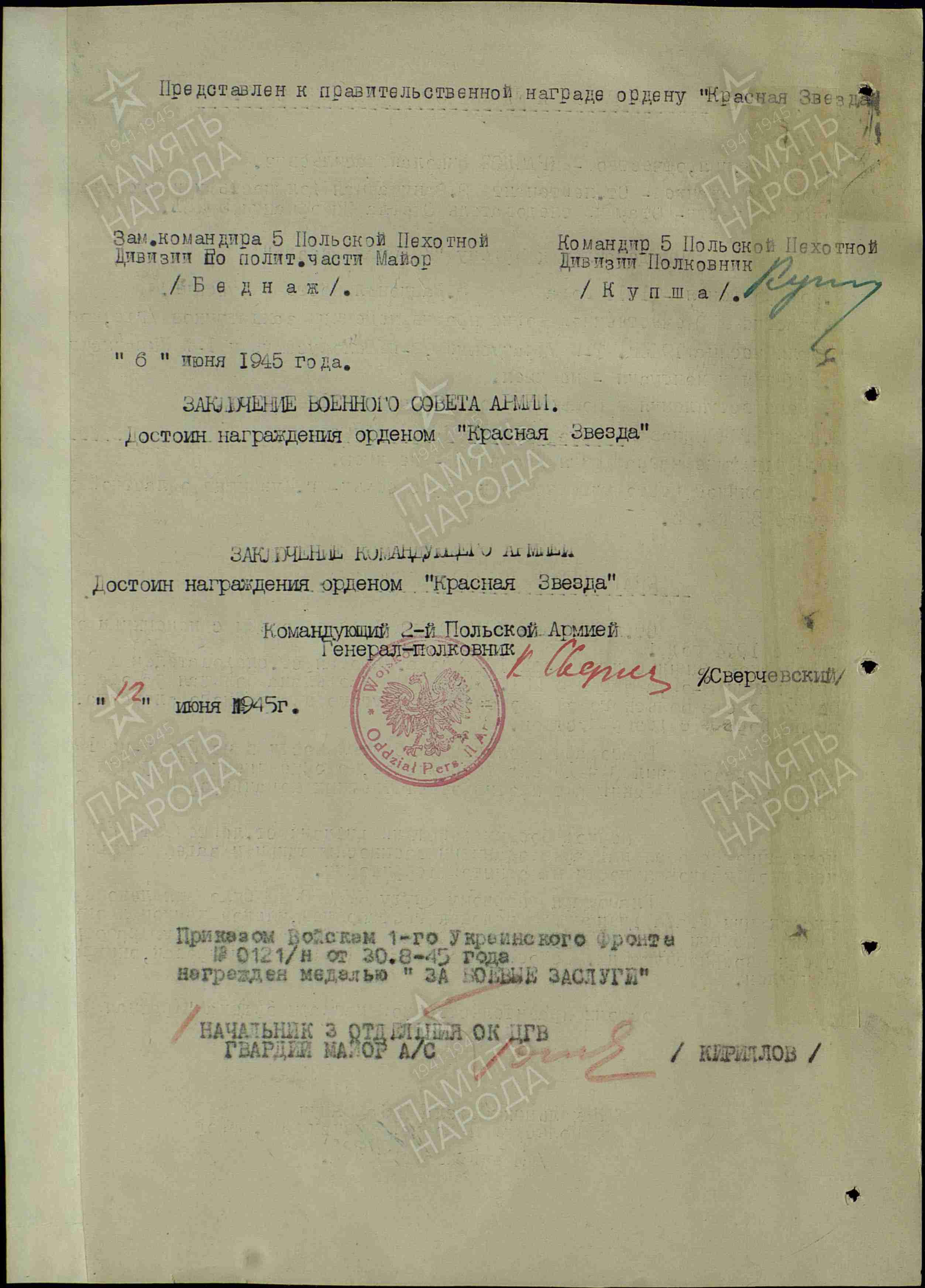 Информация из Наградного листа от 6 июня 1945 г.: «Старший лейтенант Краснов на фронте борьбы с немецкими оккупантами с 1944 года. В Польской армии с июня месяца 1944 года. Работая старшим следователем в отделе информации 8-й, а затем 5 Польской ППД, Красновым проделана большая работа по очищению Войска Польского от аковского и другого враждебного элемента, а также по борьбе с дезертирством. Благодаря проявленной бдительности в ноябре месяце 1944 года товарищ Краснов разоблачил троих террористов, которые имели намерения совершить террористический акт против ответственных командиров Польского войска. В период боевых действий дивизии старший лейтенант Краснов неустанно работал над арестованными военнослужащими и задержанными лицами немецкой национальности на занятой территорией. Благодаря упорному труду Красновым было выявлено в местах дислокации штаба дивизии 25 человек гестаповцев, членов националистической партии и фолькштурмовцев, которые вели разложенческую работу среди военнослужащих. В своей работе Краснов дисциплинирован, аккуратен, бдителен. Достоин правительственной награды ордена «Красная Звезда» (решением командования был награжден медалью «За боевые заслуги»).