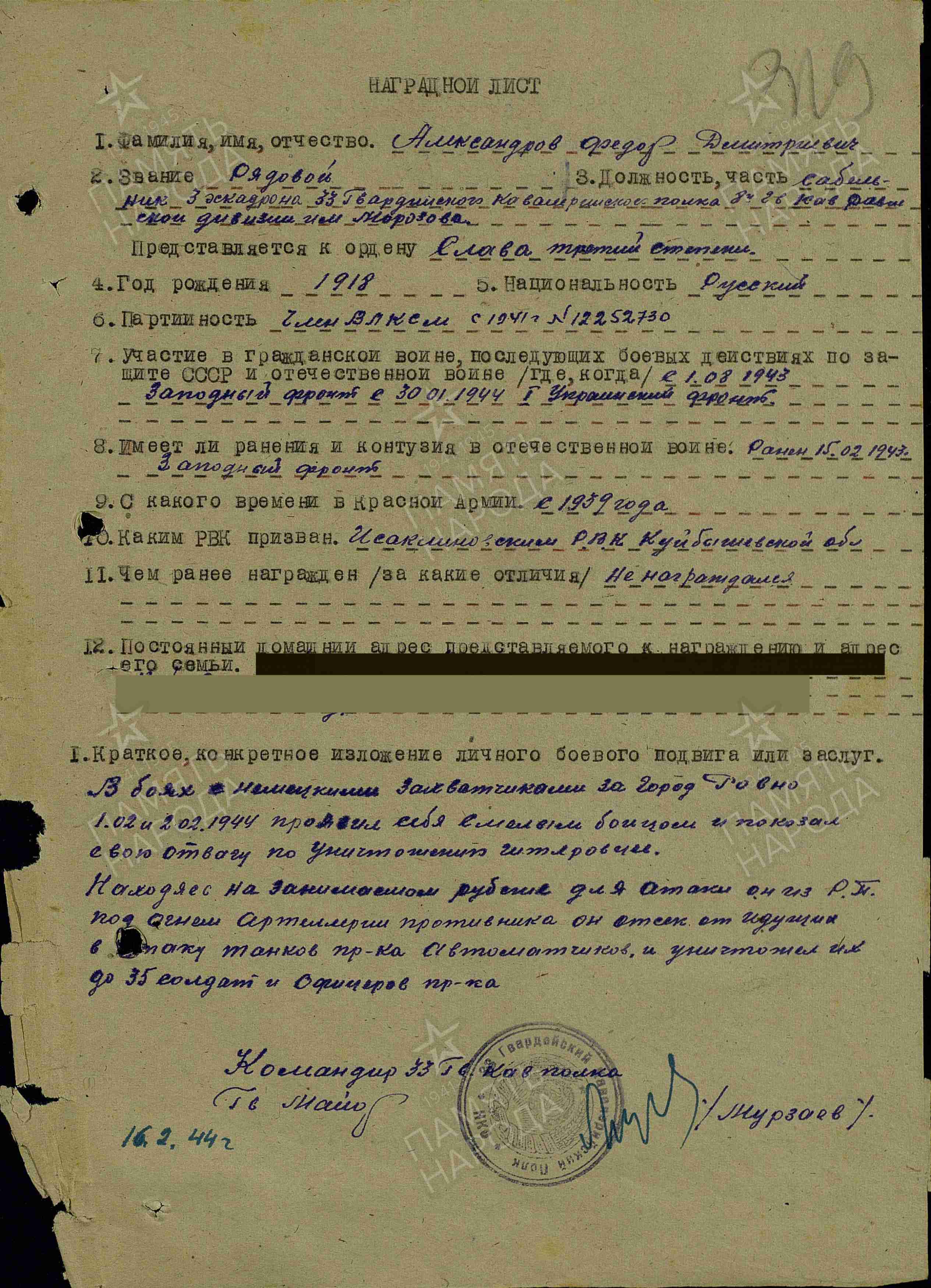 Информация из Наградного листа к ордену Славы III степени от 16.02.1944 г.: «В боях с немецкими захватчиками за город Ровно 1.02 и 2.03 проявил себя смелым бойцом и показал свою отвагу по уничтожению гитлеровцев. Находясь на занимаемом рубеже для атаки, он из Р.П. под огнем артиллерии противника он отсек от идущих в атаку танков пр-ка автоматчиков и уничтожил их до 35 солдат и офицеров противника».