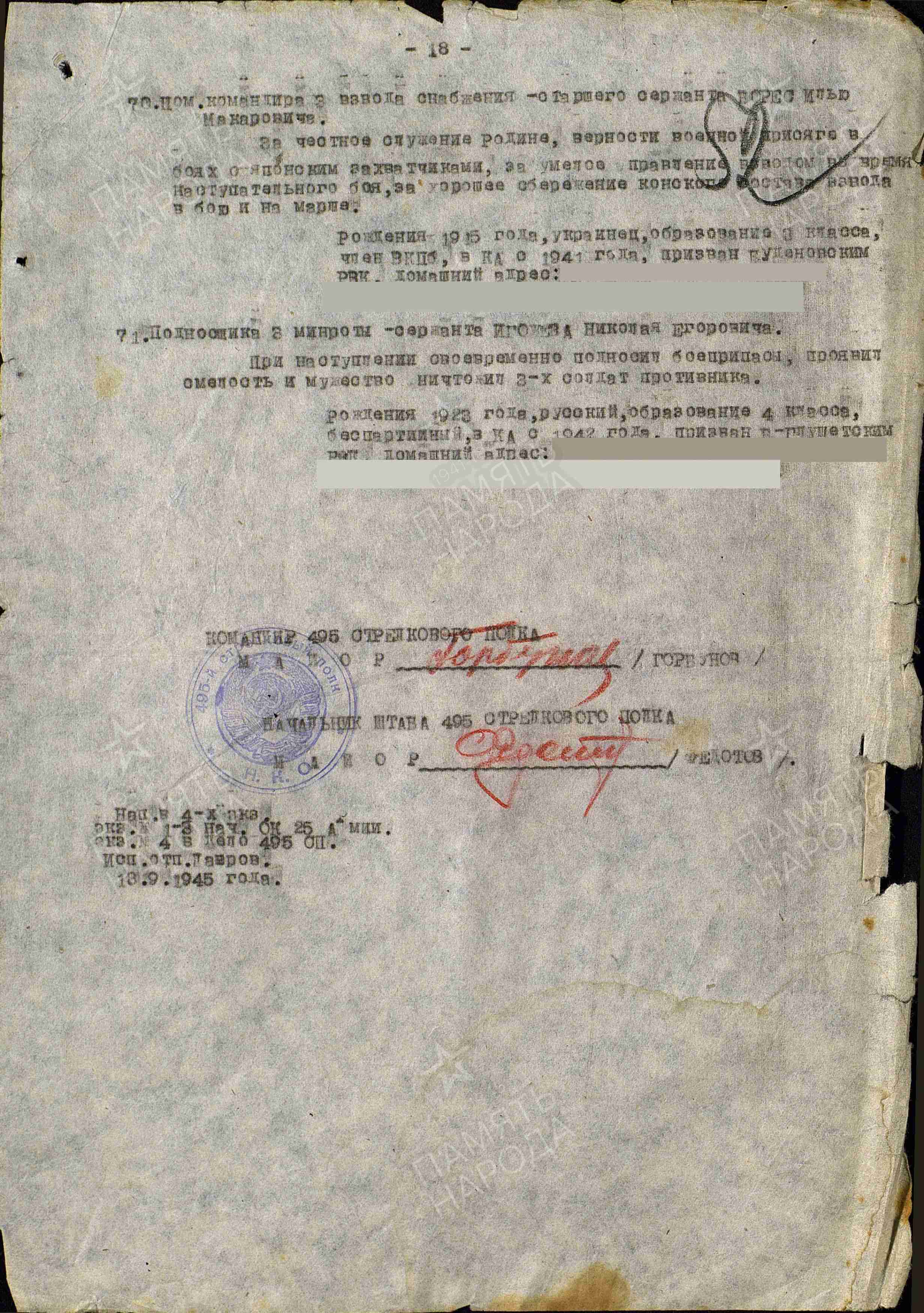 Награды: орден Красной Звезды, орден Отечественной войны, медали «За отвагу», «За боевые заслуги», «За победу над Германией в Великой Отечественной войне 1941-1945 гг.», «За победу над Японией».