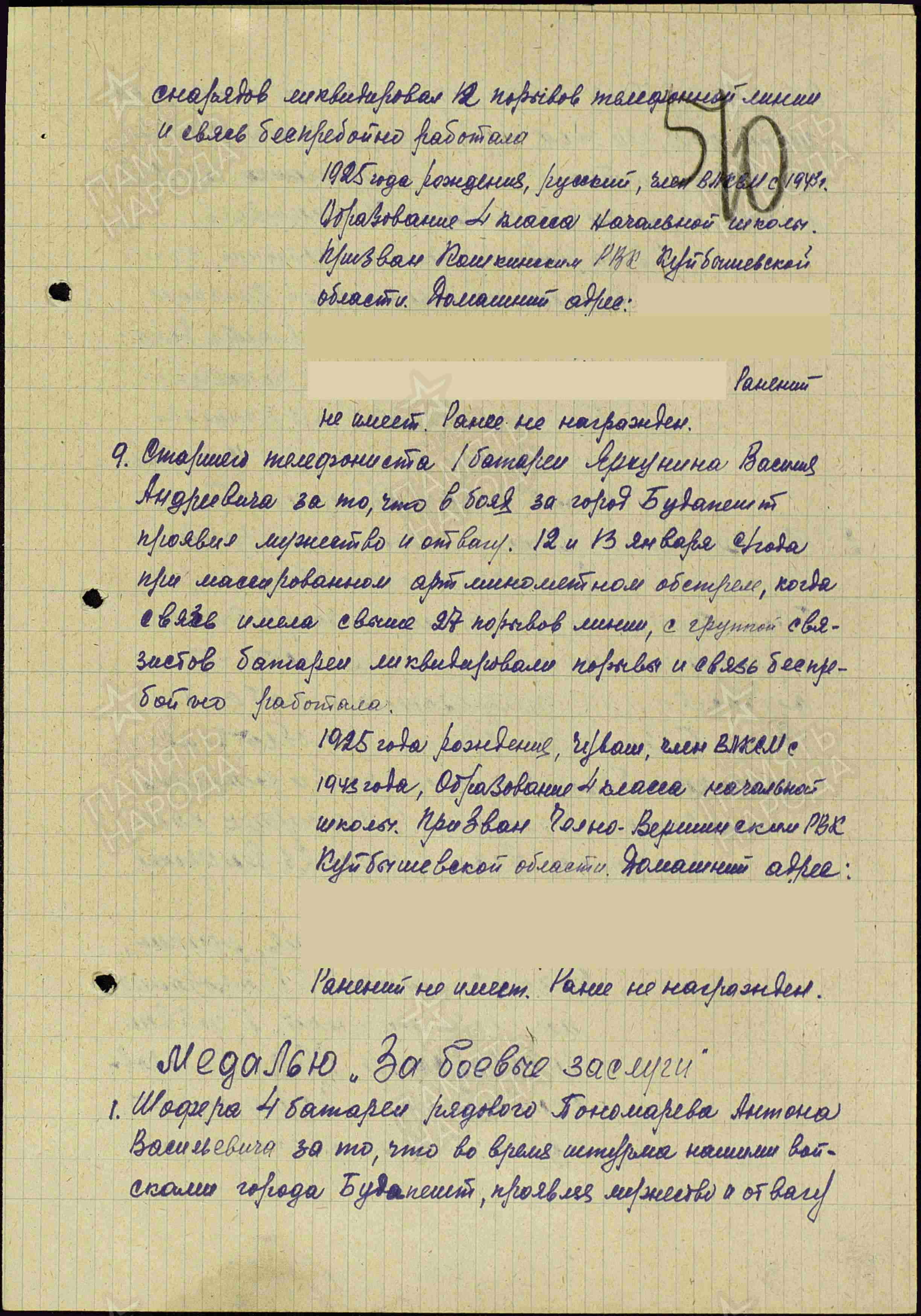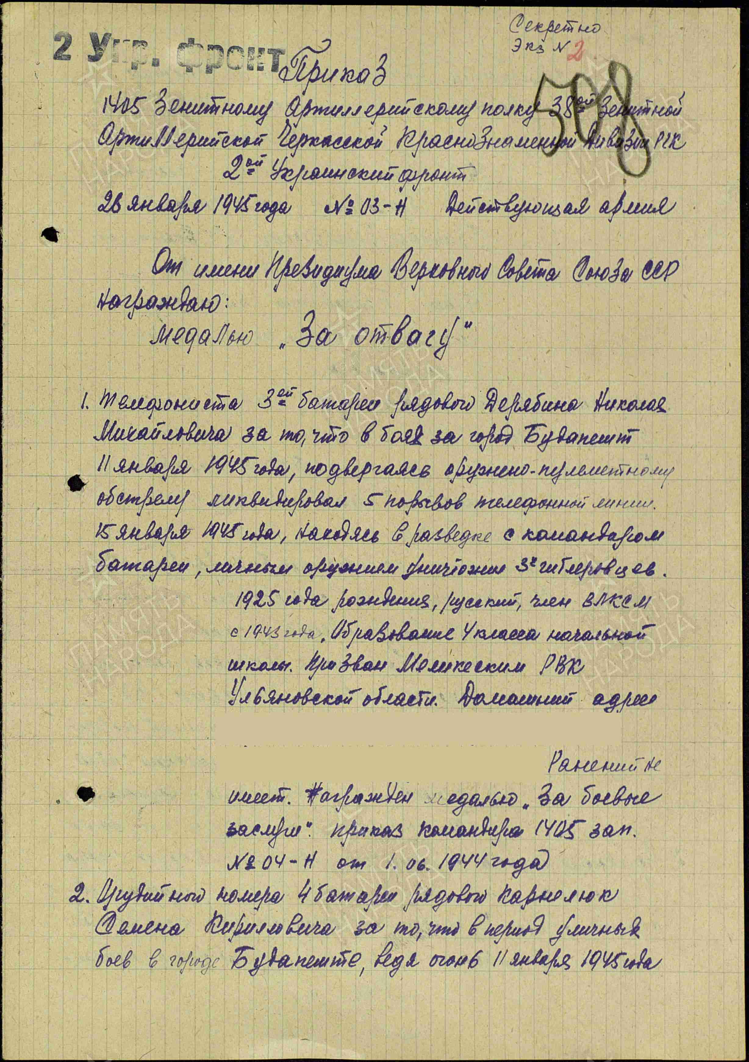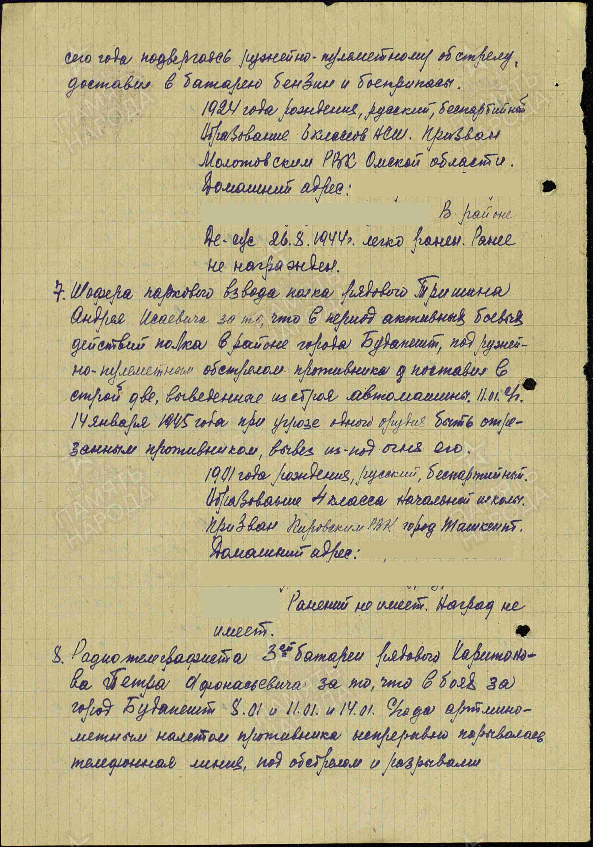 Информация из Приказа от 26 января 1945 года о награждении медалью «За отвагу»: «Радиотелеграфиста 3-ей батареи рядового Харитонова Петра Афанасьевича за то, что в боях за город Будапешт 8.01 и 11.01 и 14.01 под артминометным налетом противника непрерывно порывалась телефонная линия, под обстрелом и разрывами снарядов ликвидировал 12 порывов телефонной линии и связь бесперебойно работала».