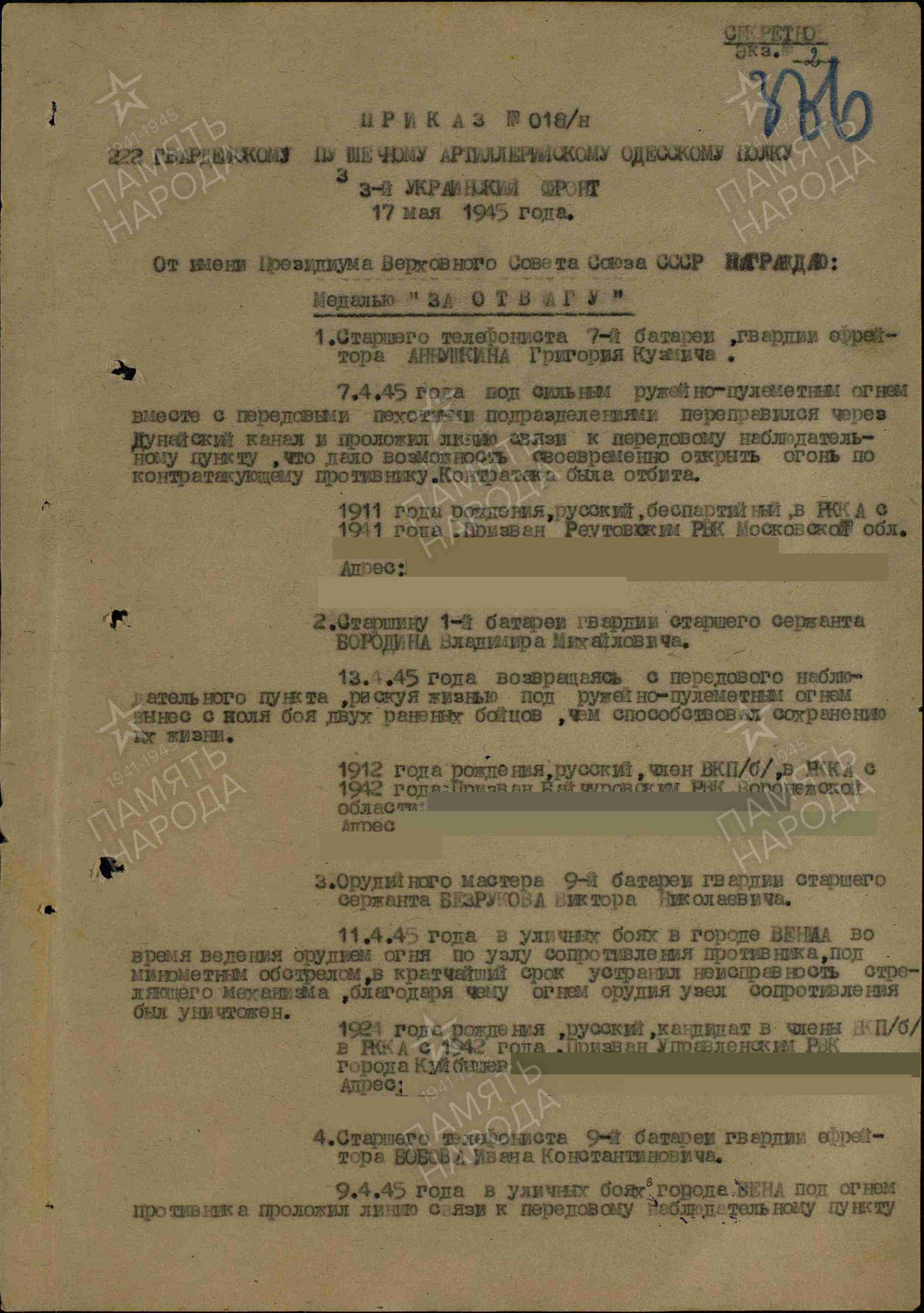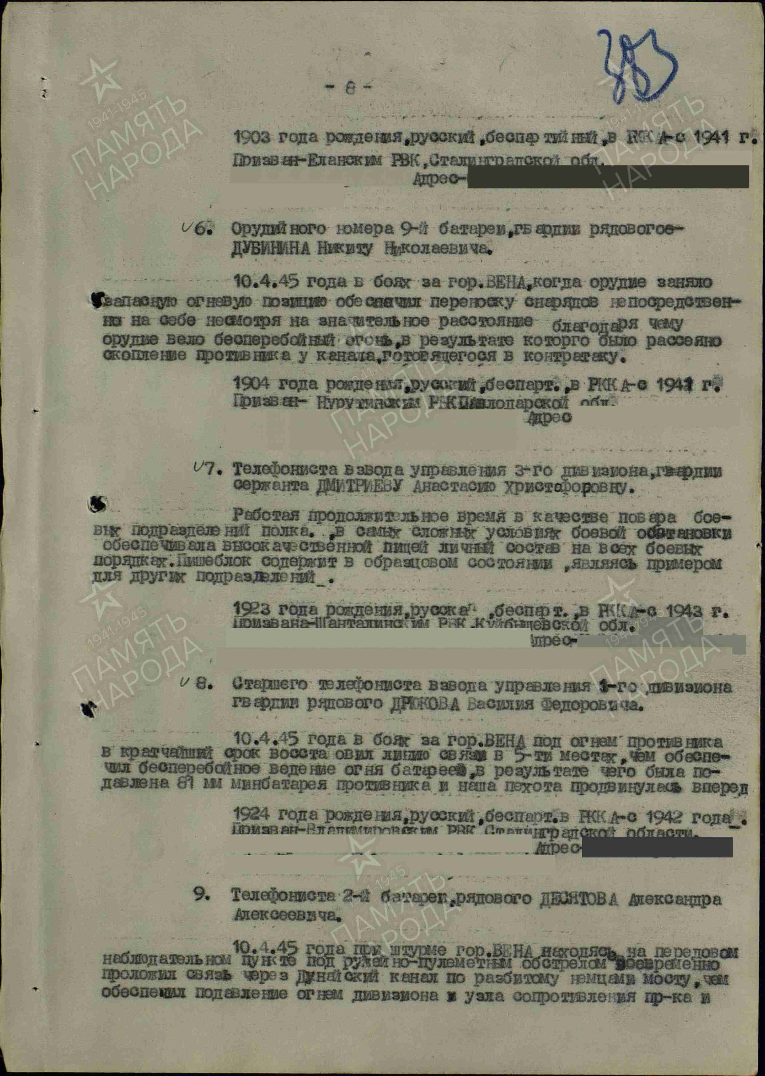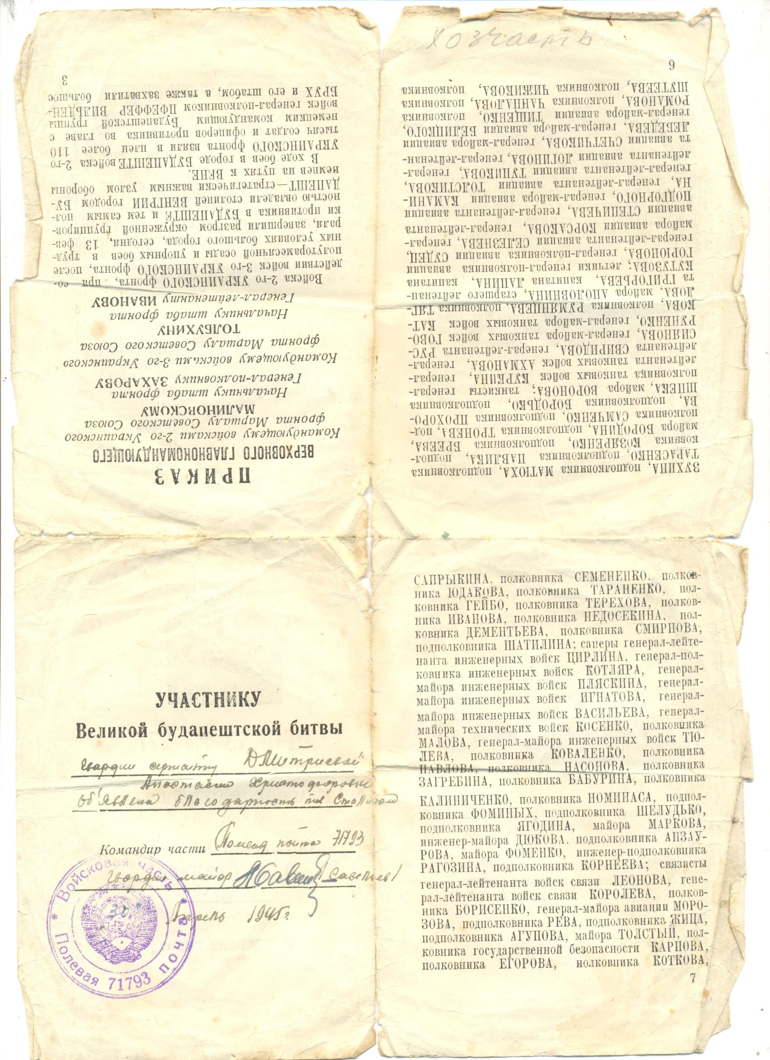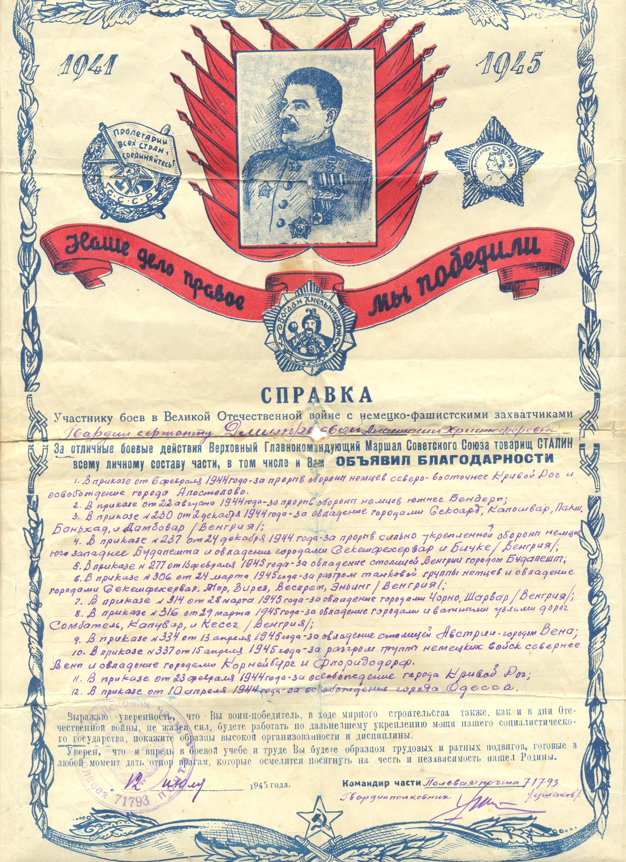 За отличные боевые действия имеет Благодарности от Верховного Главнокомандующего Маршала Советского Союза товарища СТАЛИНА: За прорыв обороны немцев северо –восточнее Кривого Рога и освобождение г. Апостолово (06.02.1944); за прорыв обороны немцев южнее Бендеры (22.08.1944); за овладение г. Сексард, Капошвар, Пакш, Баньхад и Дамбовар ( Венгрия, 02.12.1944); за прорыв сильно укрепленной обороны немцев западнее Будапешта и овладение г. Секешфехервар и Бичке (Венгрия, 24.12.1944); за овладение столицей Венгрии г. Будапешт (13.02.1945); за разгром танковой группы немцев и овладение г. Секешфехервар, Мор, Зирез, Весарст, Энвинг (Венгрия, 24.03.1945); за овладение г. Чорно, Шарвар (Венгрия, 29.03.1945); за овладение городами и важными узлами дорог Сомбатель, Капувар и Кесег (Венгрия, 29.03.1945); за овладение столицей Австрии - городом Вена (13.04.1945); за разгром группы немецких войск севернее Вены и овладение г. Корнейбург и Флоридодорф (15.04.1945); за освобождение города Кривой Рог (23.02.1944); за освобождение города Одесса (10.04.1944).