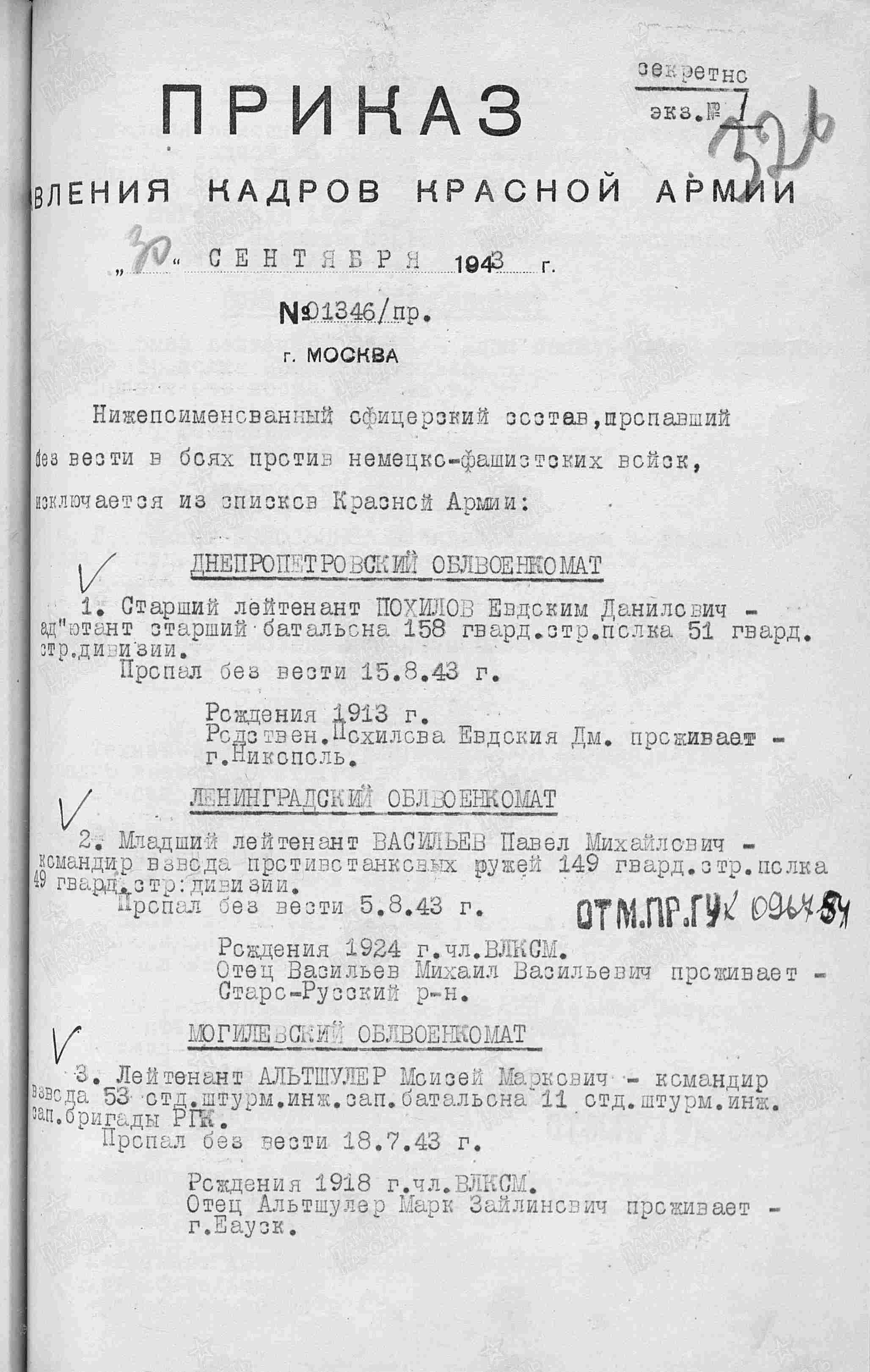 Воинское звание: мл. лейтенант. Воинская часть: 1100 стрелковый полк 327 стрелковой дивизии. Михаил Лазаревич пропал без вести в 1942 г. под г. Сталинградом. Других сведений о нем на сегодняшний день нет.