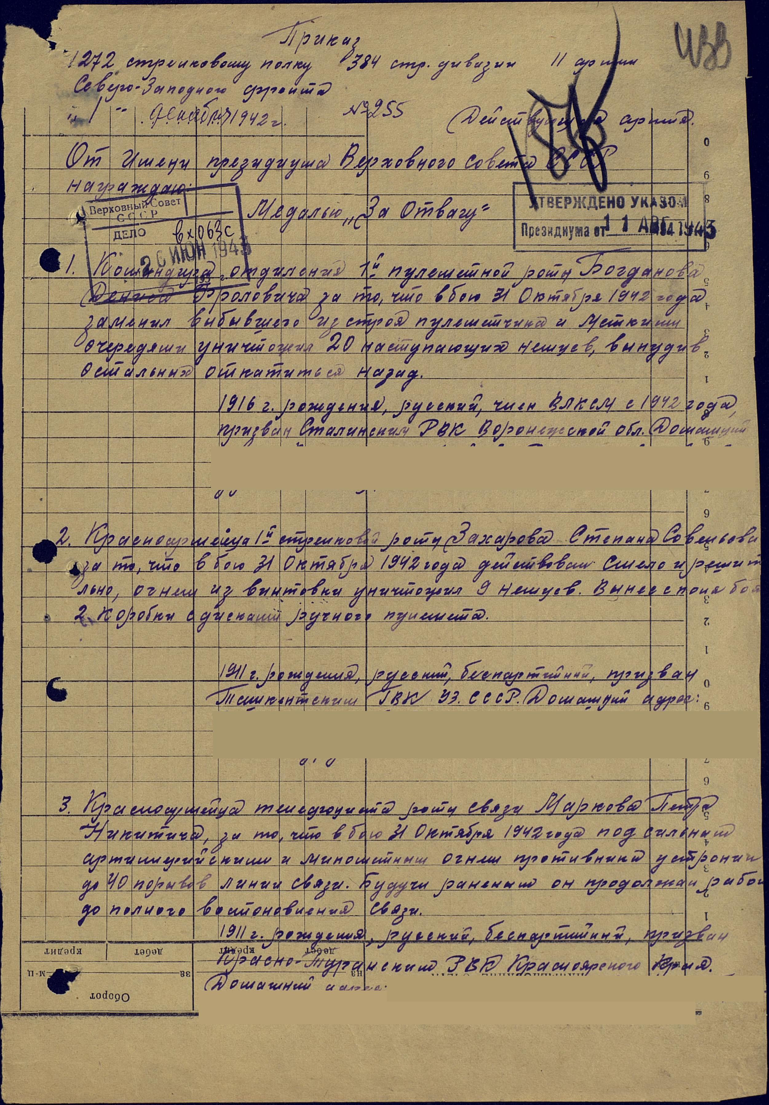 31 октября 1942 года в бою он действовал смело и решительно. Огнём из винтовки он уничтожил 9 оккупантов, вынес с поля боя 2 коробки с дисками для ручного пулемёта.