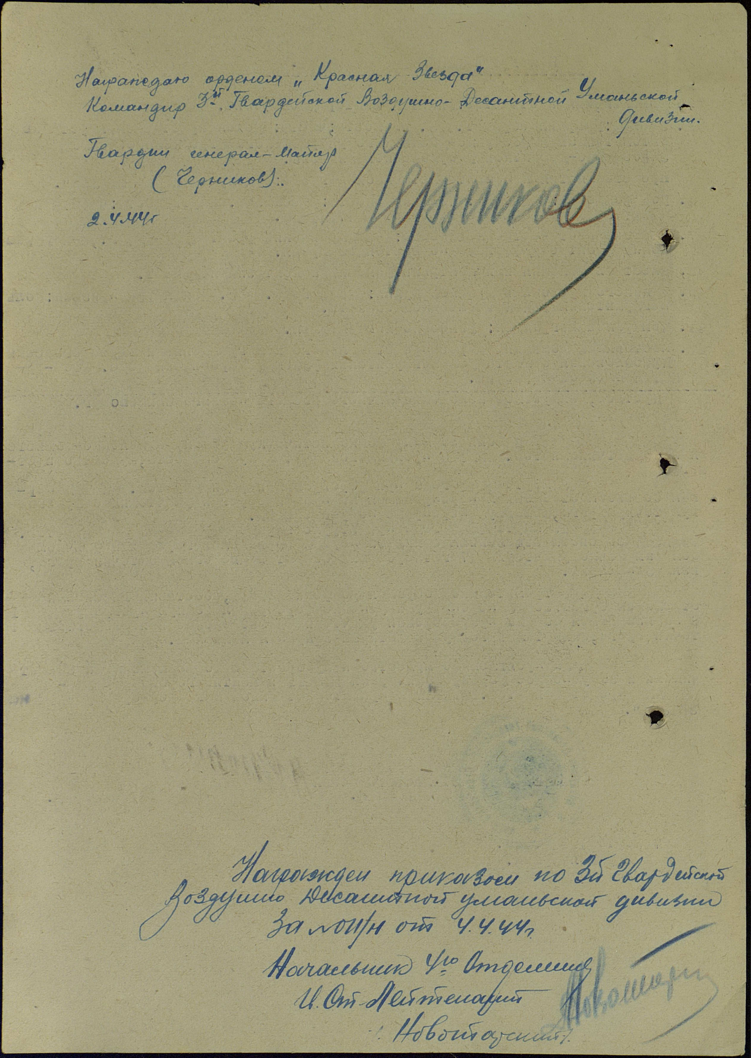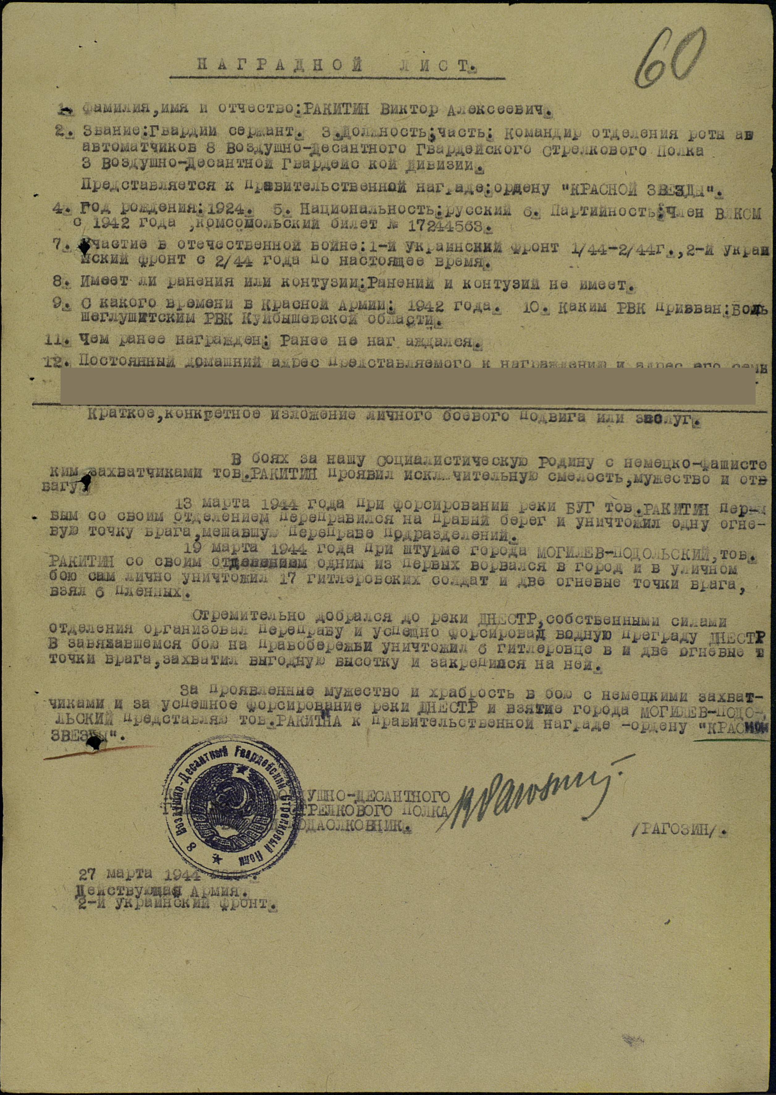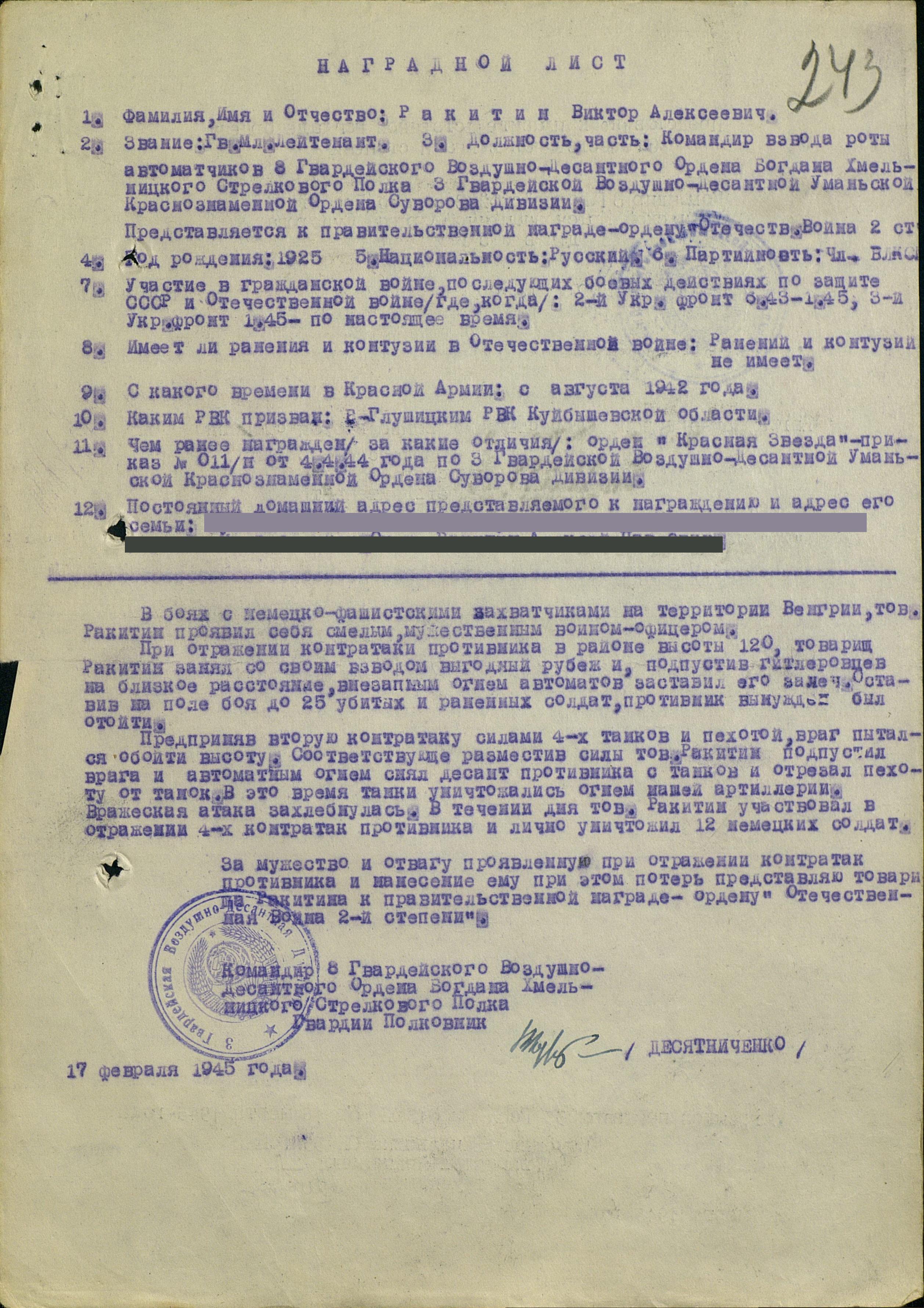 Мой прадед, Ракитин Виктор Алексеевич, родился в 1924 году в селе Морша Большеглушицкого района Куйбышевской области. В РККА был призван в 1942 году. Воевал в составе 8-го гвардейского воздушно-десантного ордена Богдана Хмельницкого стрелкового полка 3-й гвардейской воздушно-десантной Уманьской Краснознамённой ордена Суворова дивизии. Был командиром отделения роты автоматчиков.
