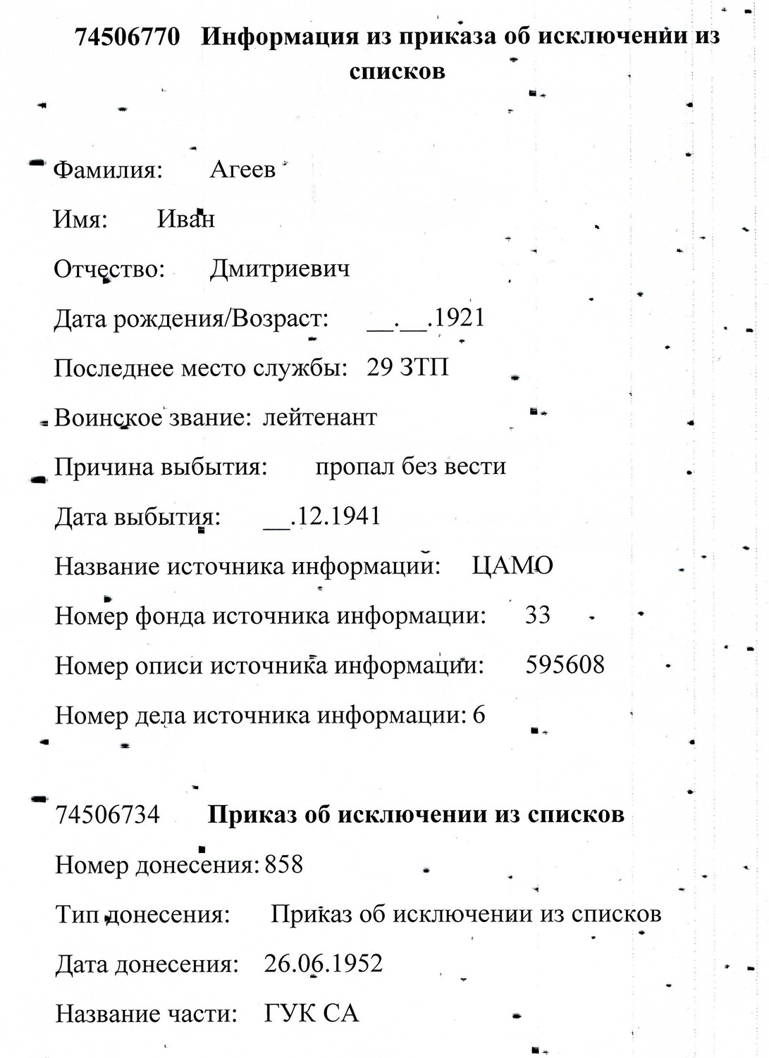 В ряды Красной армии Иван Агеев был призван в 1940-м и ушел на фронт в первые дни Великой Отечественной войны. Служил в должности командира взвода малых танков 29-го запасного танкового полка. В декабре 1941-го 20-летний Иван Дмитриевич Агеев пропал без вести.