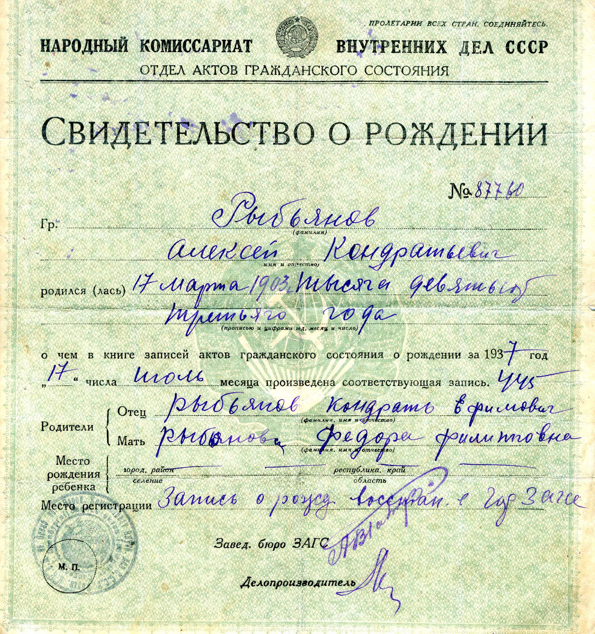 Алексей Кондратьевич Рыбьянов родился 17 июля 1903 года в селе Кардаилово Илекского района Чкаловской области (сегодня Илекский район Оренбургской области). Потомок украинских казаков, трудолюбивый и набожный, он остался в памяти семилетней дочери Веры добрым, чутким, высокой крестьянской культуры человеком.