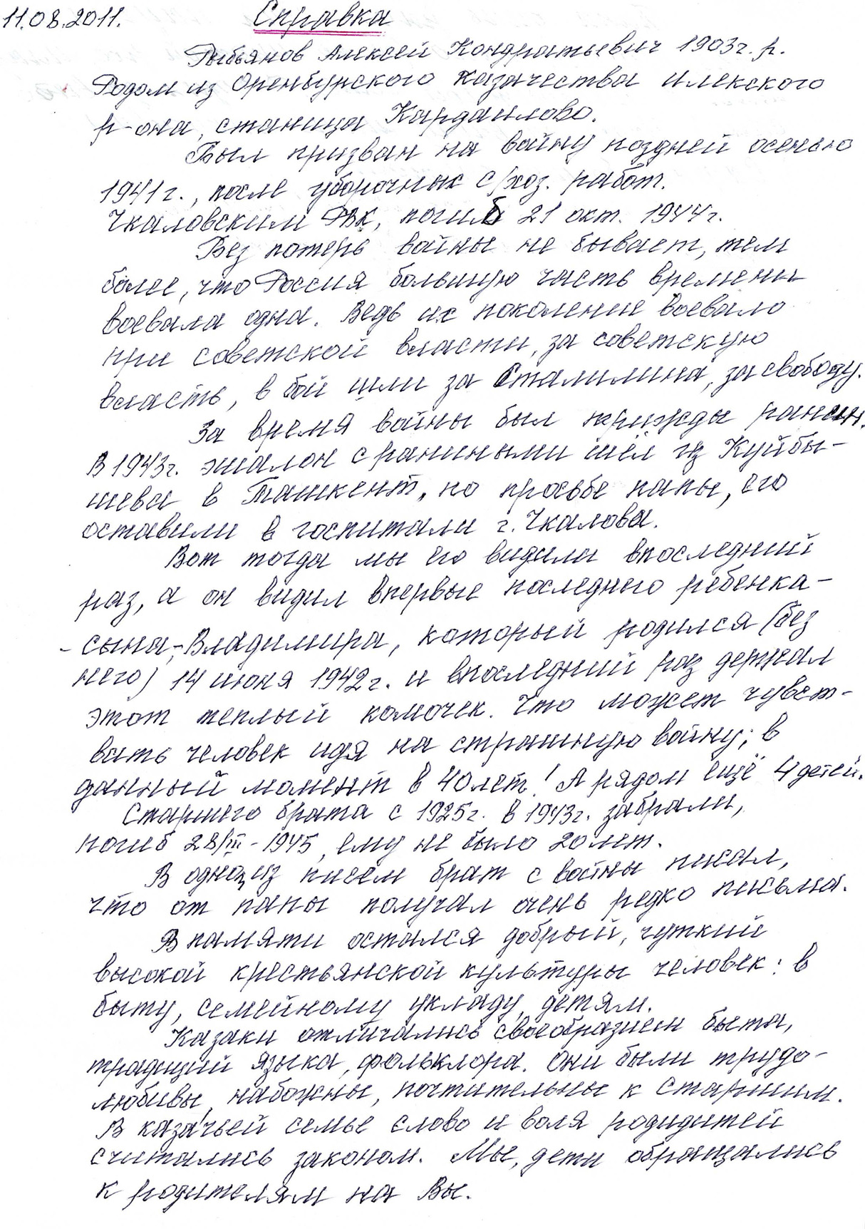 После очередного ранения в 1943 году Алексей Кондратьевич попросил оставить его в госпитале города Чкалова (сегодня Оренбург), когда эшелон с ранеными шел из Куйбышева в Ташкент – так ему хотелось увидеть семью и младшего сына Владимира, рожденного уже без него – в июне 1942 года. Это была его последняя встреча с родными.