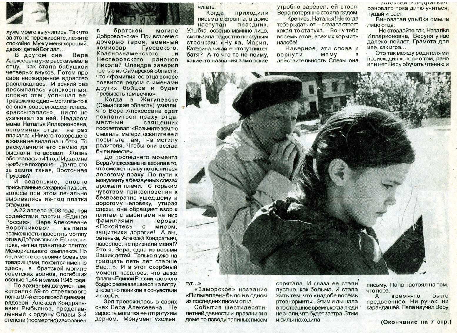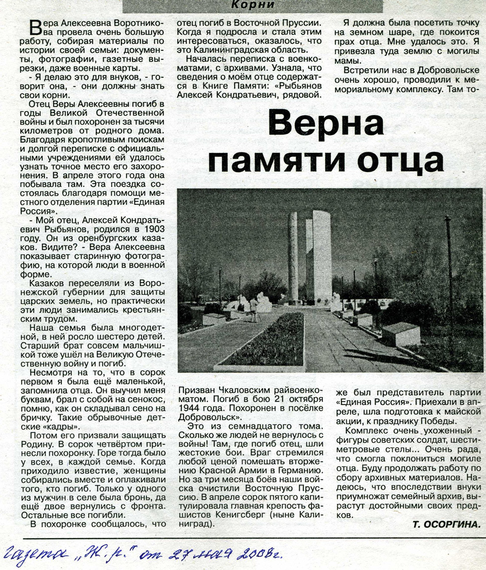 Спустя много лет дочь Алексея Кондратьевича Вера Алексеевна Воротникова отыскала могилу отца и в 2008 году, взяв семейный архив и землю с могилы матери, побывала на мемориальном комплексе, где похоронен ее отец.
