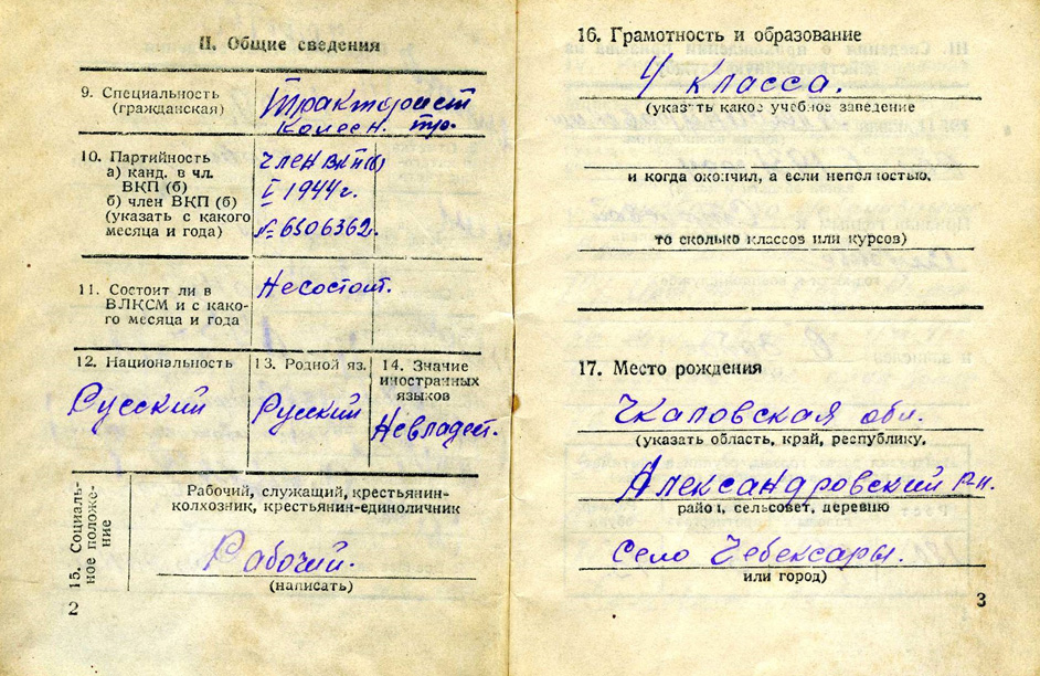 Родился в 1909 г. в с. Чебоксарово Оренбургской области. До войны работал трактористом.