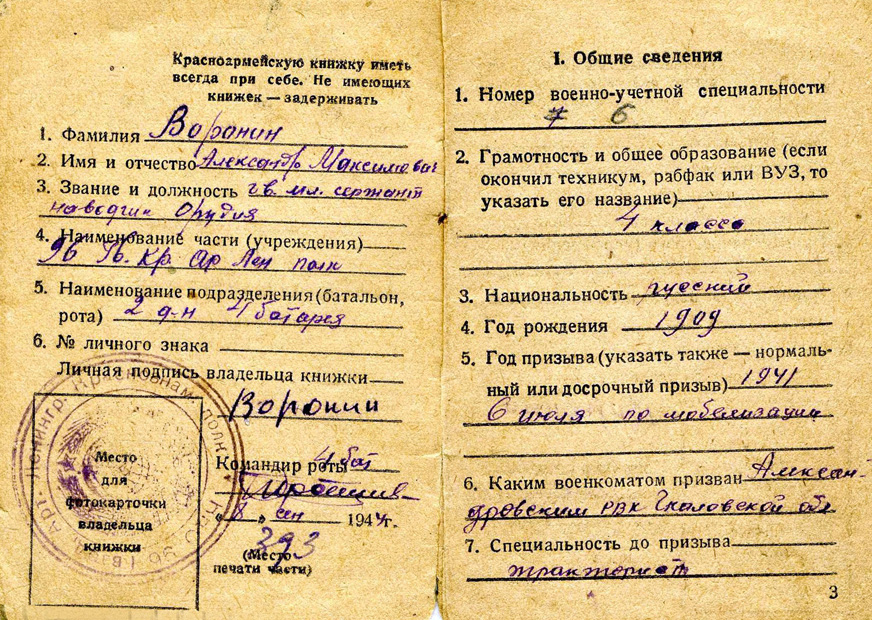 Наградить медалью «За отвагу» наводчика орудия 4-й батареи гвардии младшего сержанта Воронина Александра Максимовича за то, что в боях 24 февраля 1945 г. при форсировании р. Вартая (Латвия) из своего орудия уничтожил 2 пулеметные точки и подавил одну минометную батарею противника. При отражении двух контратак рассеяно до роты вражеской пехоты и уничтожено до десятка гитлеровцев (наградной лист от 2.03.1945 г.).