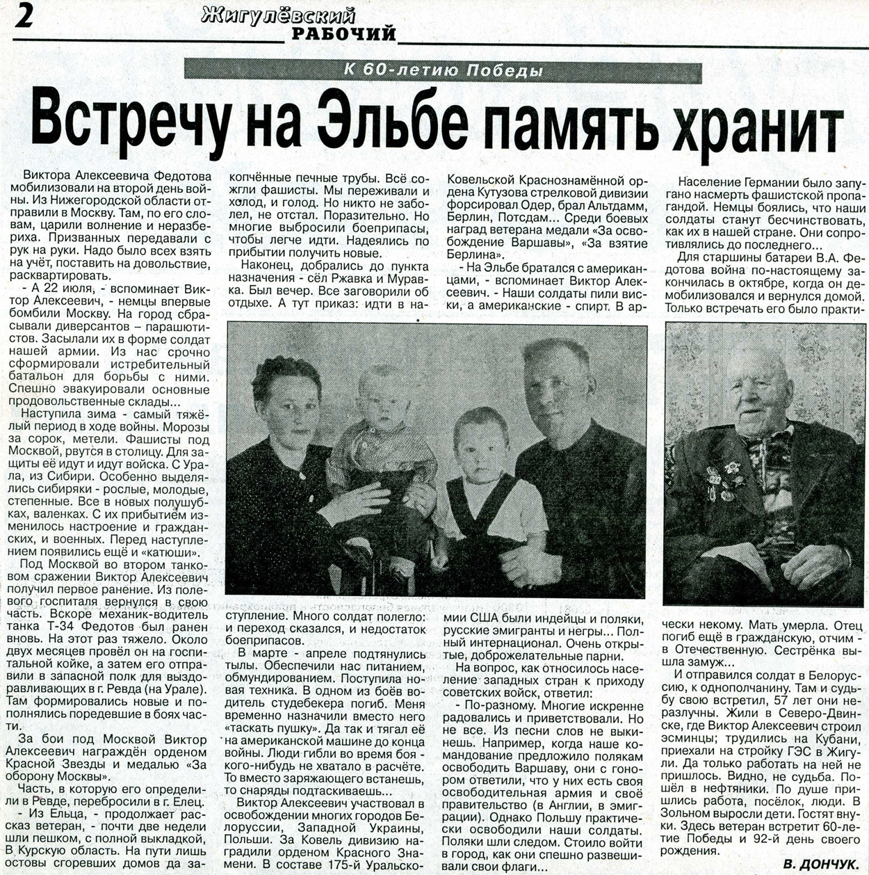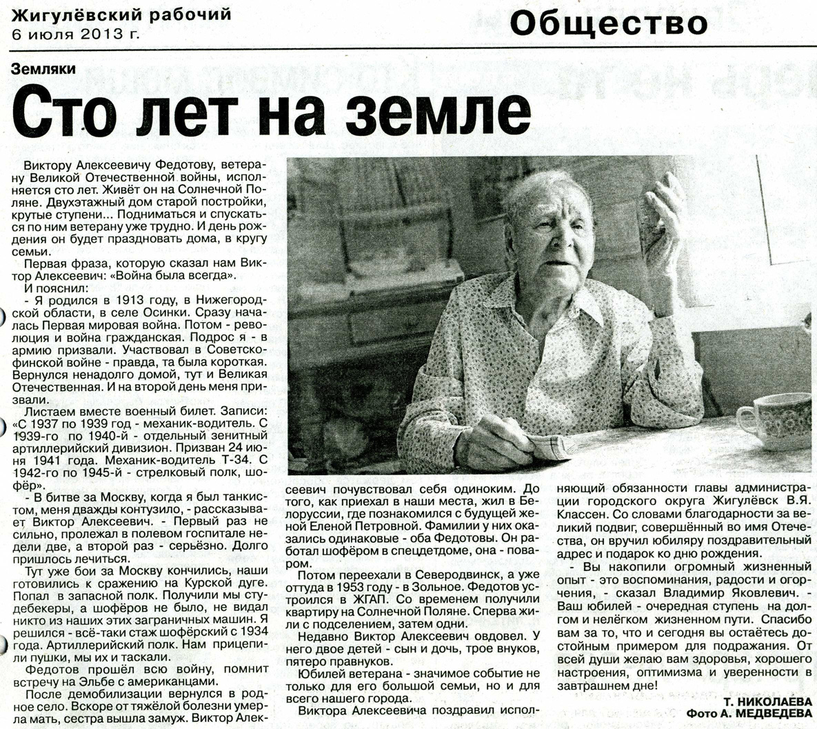 Из воспоминаний В.А. Федотова: «В битве за Москву, когда я был танкистом, меня дважды контузило, первый раз не сильно, пролежал в полевом госпитале недели две, а второй раз – серьезно, два месяца пришлось лечиться. Потом меня отправили в запасной полк для выздоравливающих в г. Ревда (на Урале). Там формировались новые и пополнялись поредевшие в боях части. Часть, в которую определили в Ревде, перебросили в г. Елец. Из Ельца шли пешком в Курскую область. На пути лишь остовы сгоревших домов да закопченные печные трубы. Всё сожгли фашисты. Мы переживали и холод, и голод, но никто не заболел, не отстал. Многие выбросили боеприпасы, чтобы легче идти. Надеялись по прибытии получить новые. Добрались до пункта назначения с. Ржавка и с. Муравка вечером и сразу, без отдыха, приказ: идти в наступление. Много тогда солдат полегло: и переход сказался, и недостаток боеприпасов. В марте-апреле подтянулись тылы. Обеспечили нас питанием, обмундированием, поступила новая техника. В одном из боев водитель студебекера погиб. Меня временно назначили вместо него «таскать пушку», да так и тягал её на американской машине до конца войны. Люди гибли во время боя, кого-нибудь не хватало в расчёте. То вместо заряжающего встанешь, то снаряды подтаскиваешь».
