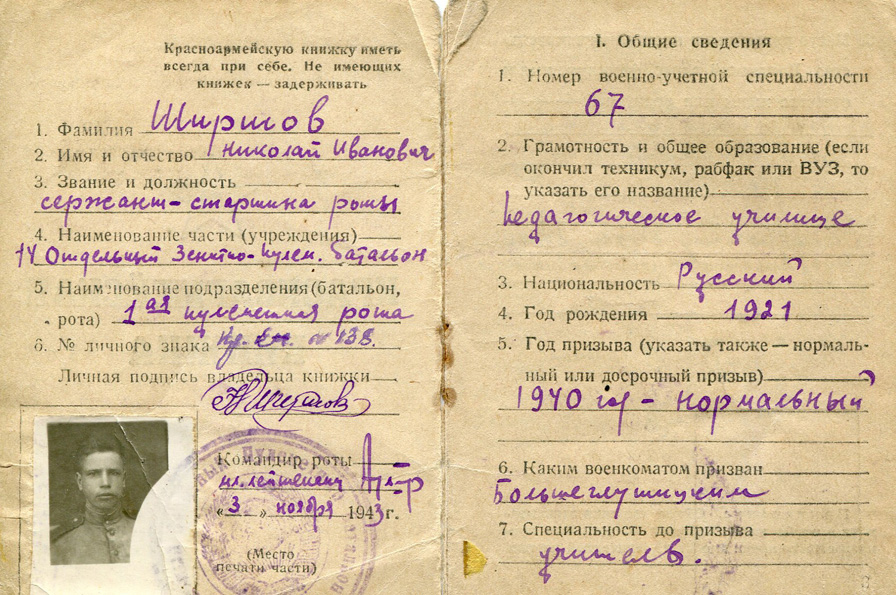 Николай Иванович Ширшов родился 5 декабря 1921 года в селе Мокша Большеглушицкого района. Окончил педагогическое училище. В ряды Красной армии был призван в 1940-м. Носил звание старшего сержанта, затем – старшины. За годы службы был командиром отделения, помощником командира взвода, комсоргом пулемётного батальона. В составе 1-го Белорусского фронта освобождал братскую Польшу, с боями дошёл до Германии, участвовал в штурме Берлина.