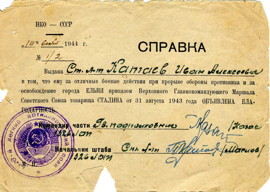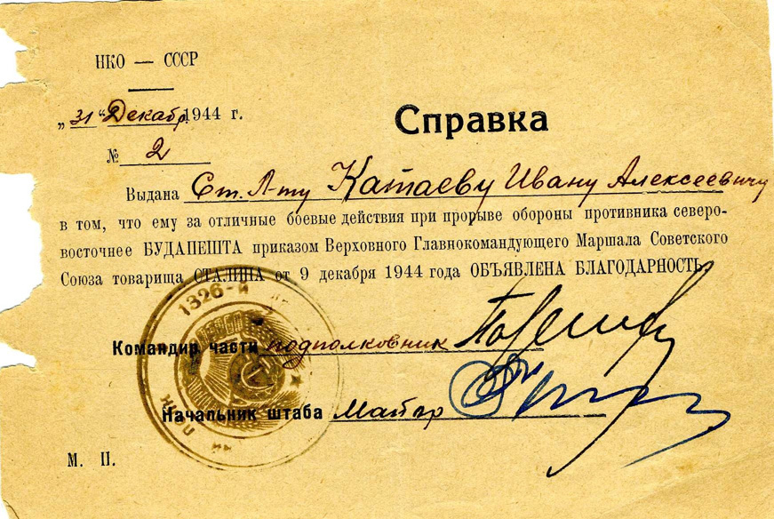 Иван Алексеевич участвовал в освобождении Ельни, Смоленска, Выборга, его боевой путь пролегал через Венгрию, Румынию, Австрию, Чехословакию. Фронтовыми дорогами Иван Катаев дошел до Победы.