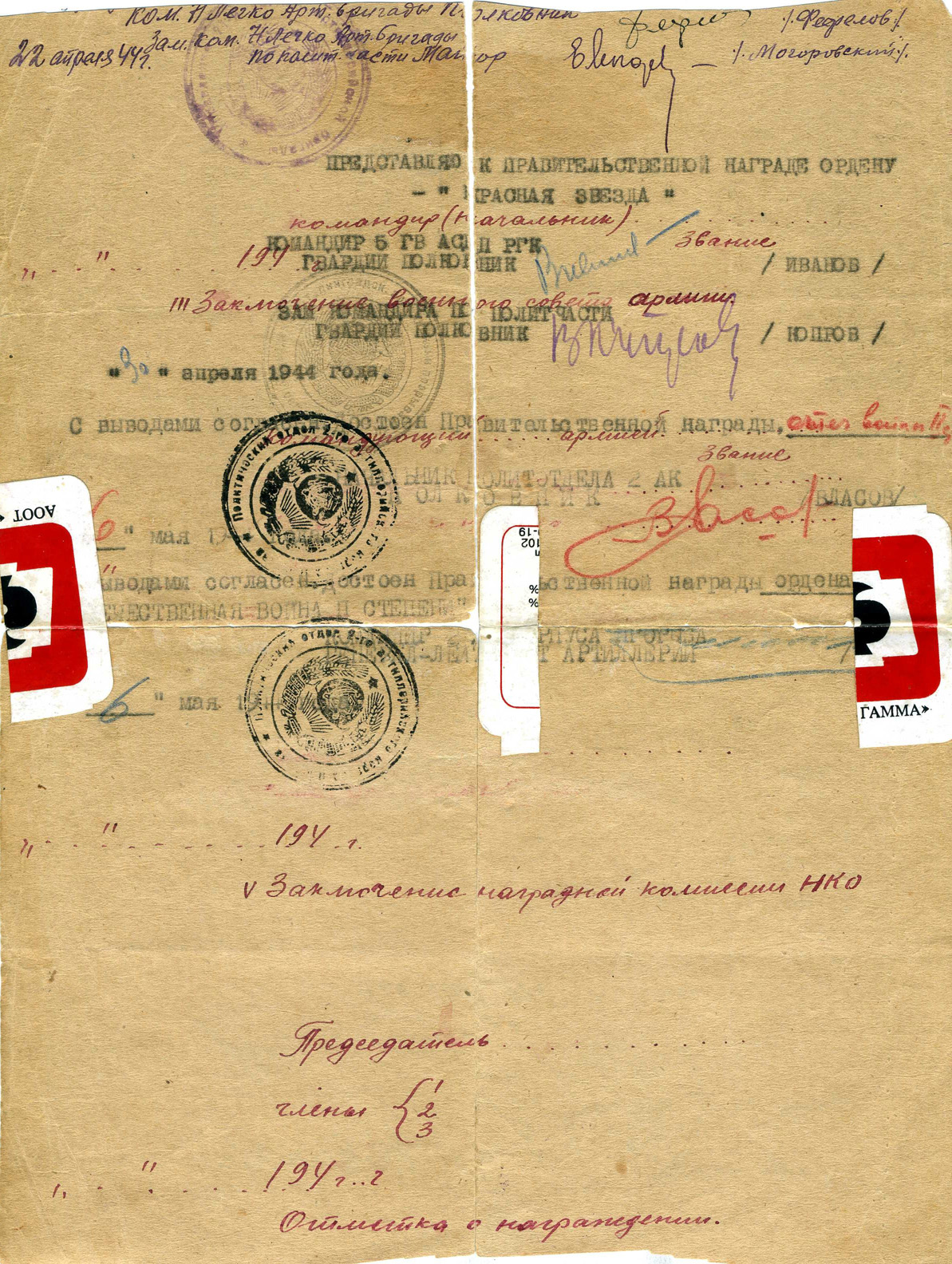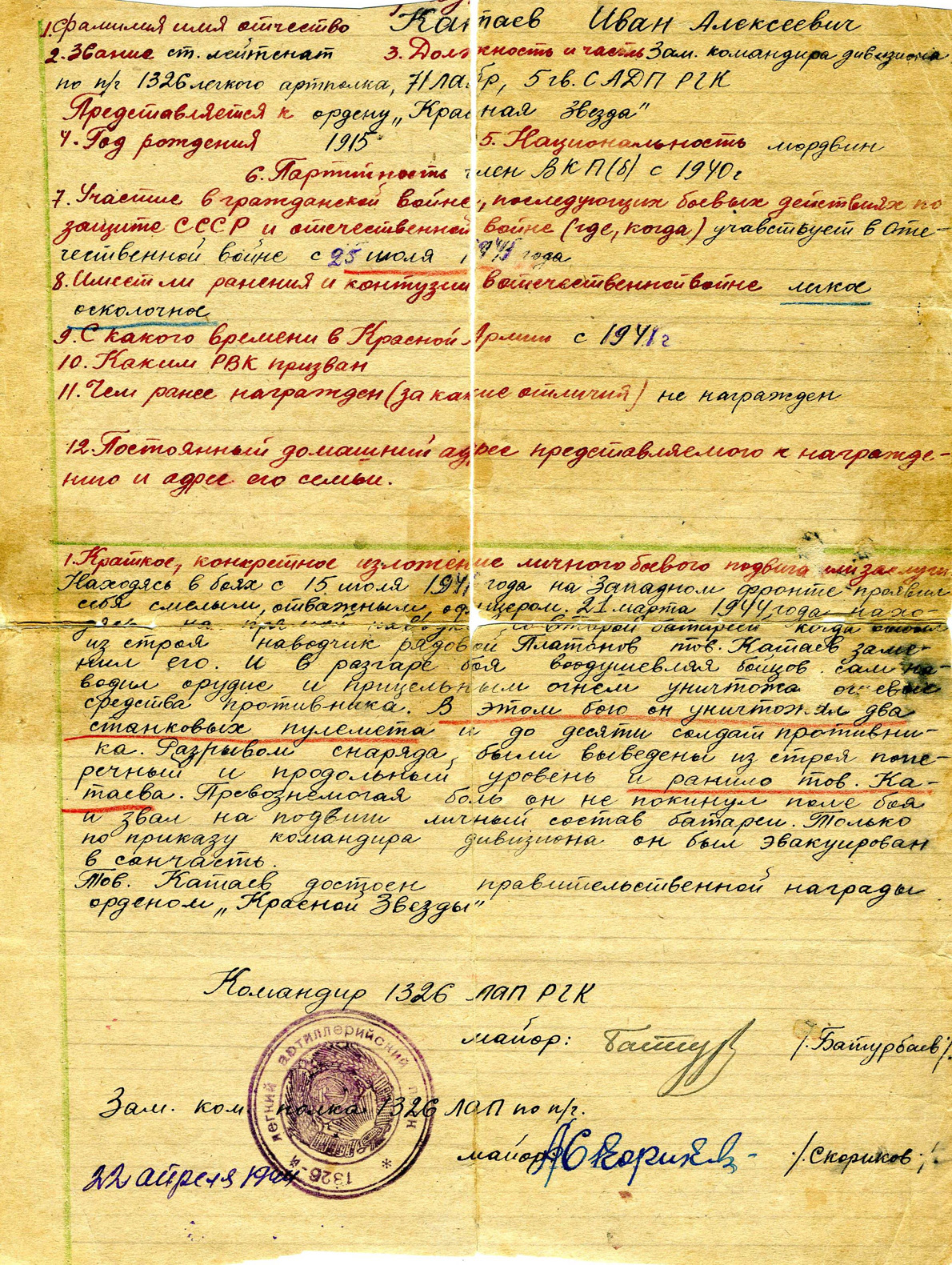 Красная Звезда на груди старшего лейтенанта Катаева засияла после боевого подвига на Западном фронте. В документе о представлении к правительственной награде значится: «находясь в боях с 15 июля 1944 года на Западном фронте, проявил себя смелым, отважным офицером. 21 марта1944 года, находясь на прямой наводке со второй батареей, когда вышел из строя наводчик рядовой Платонов, тов. Катаев заменил его. И в разгаре боя воодушевлял бойцов. Сам наводил орудие и прицельным огнём уничтожал огневые средства противника. В этом бою он уничтожил два станковых пулемёта и до десяти солдат противника. Разрывом снаряда были выведены из строя поперечный и продольный уровень, и ранило тов. Катаева. Превозмогая боль, он не покинул поле боя и звал на подвиги личный состав батареи. Только по приказу командира дивизиона он был эвакуирован в санчасть».