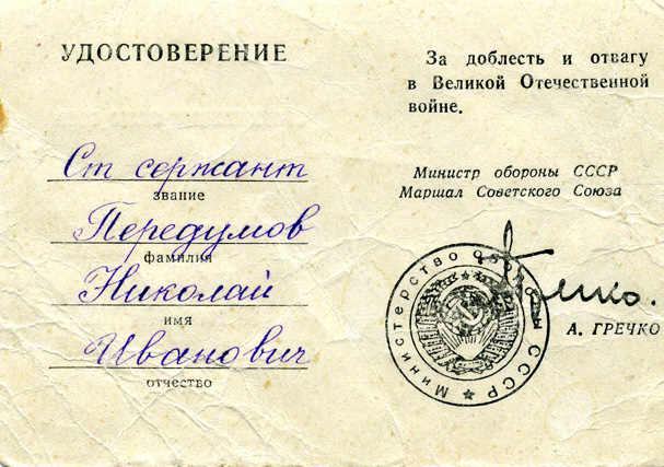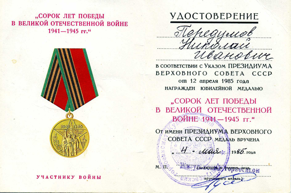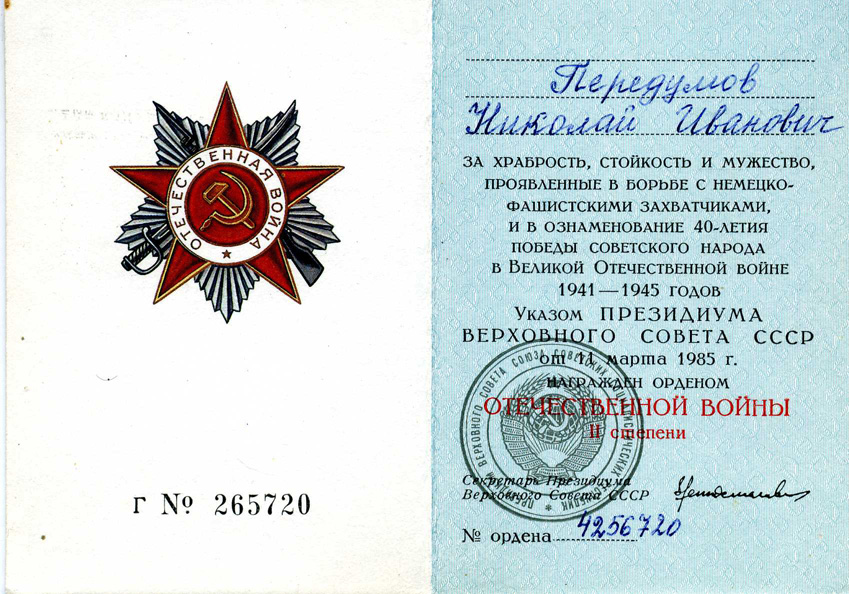 За мужество и доблесть, проявленные в борьбе с немецко-фашистскими захватчиками, Николай Иванович Передумов награжден медалью «За отвагу», орденом Отечественной войны 2 степени.