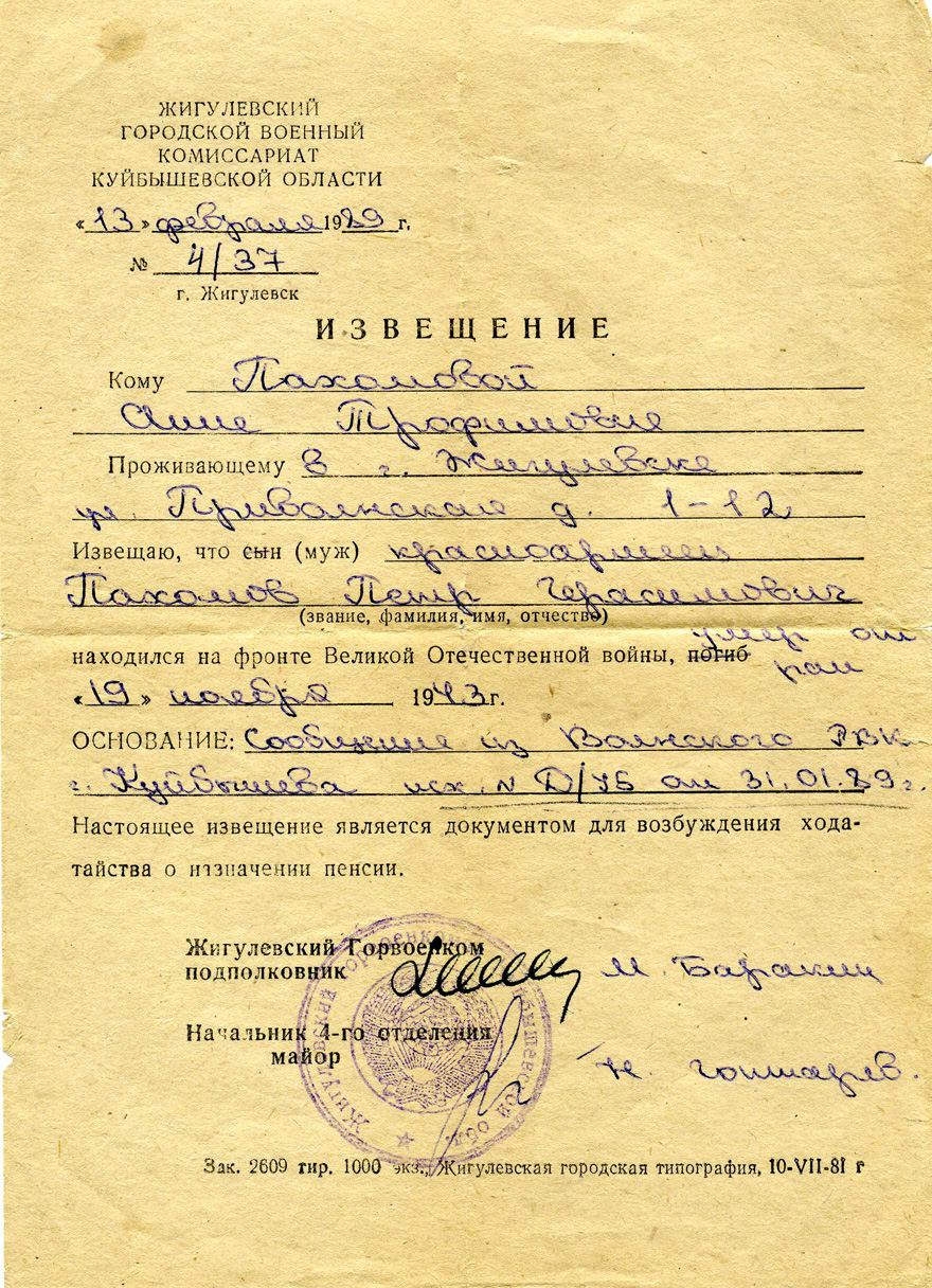 Петр Герасимович Пахомов родился в 1898 году, в мирное время работал на на строительстве Куйбышевского гидроузла, на жигулевском известковом заводе в селе Ширяево. На фронтах Великой Отечественной воевал с 1 октября 1941-го, носил звание красноармеец. Во время одного из боев Петр Герасимович был ранен. Спасти его не удалось. Петр Пахомов умер от ран 19 ноября 1943 года.