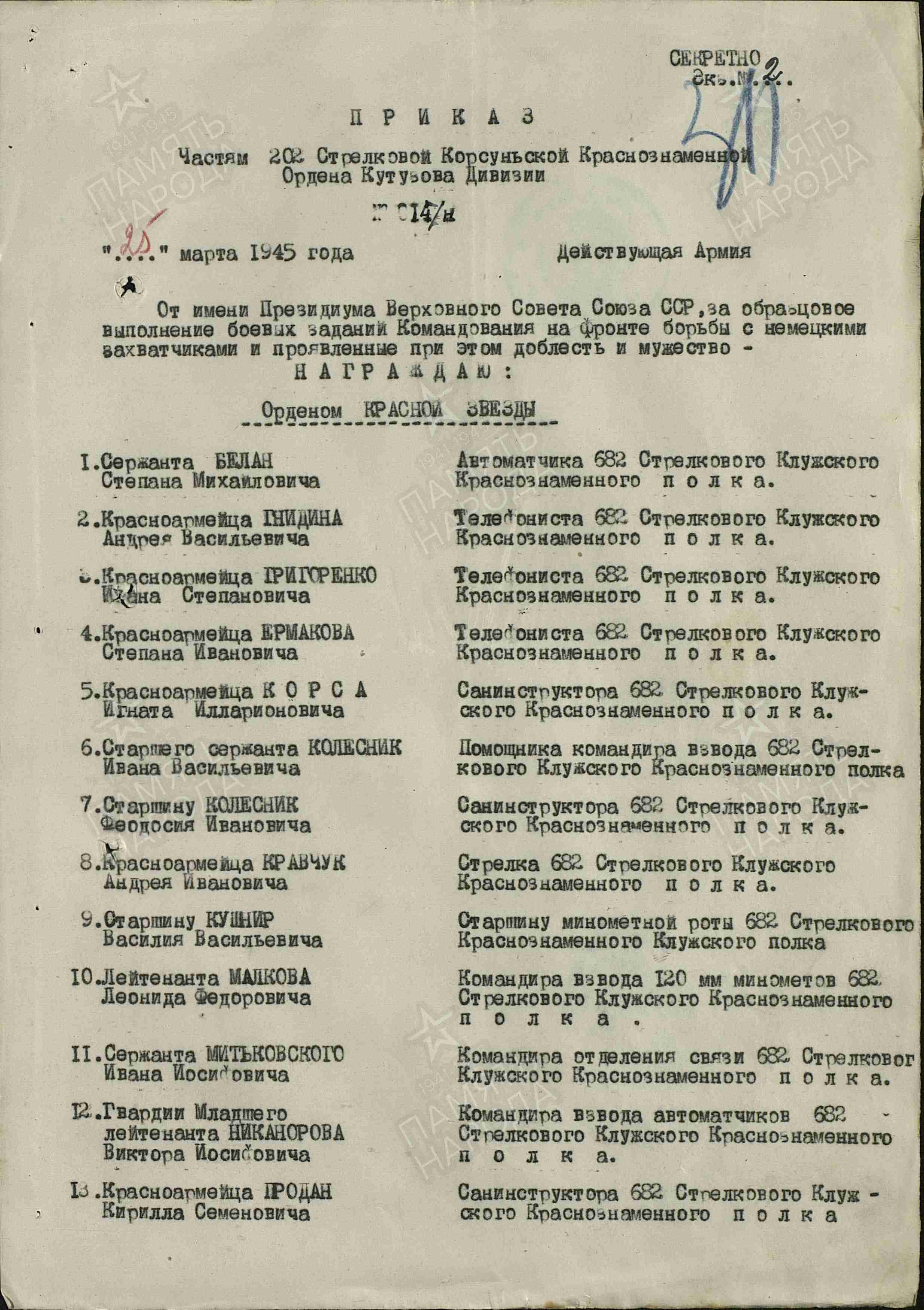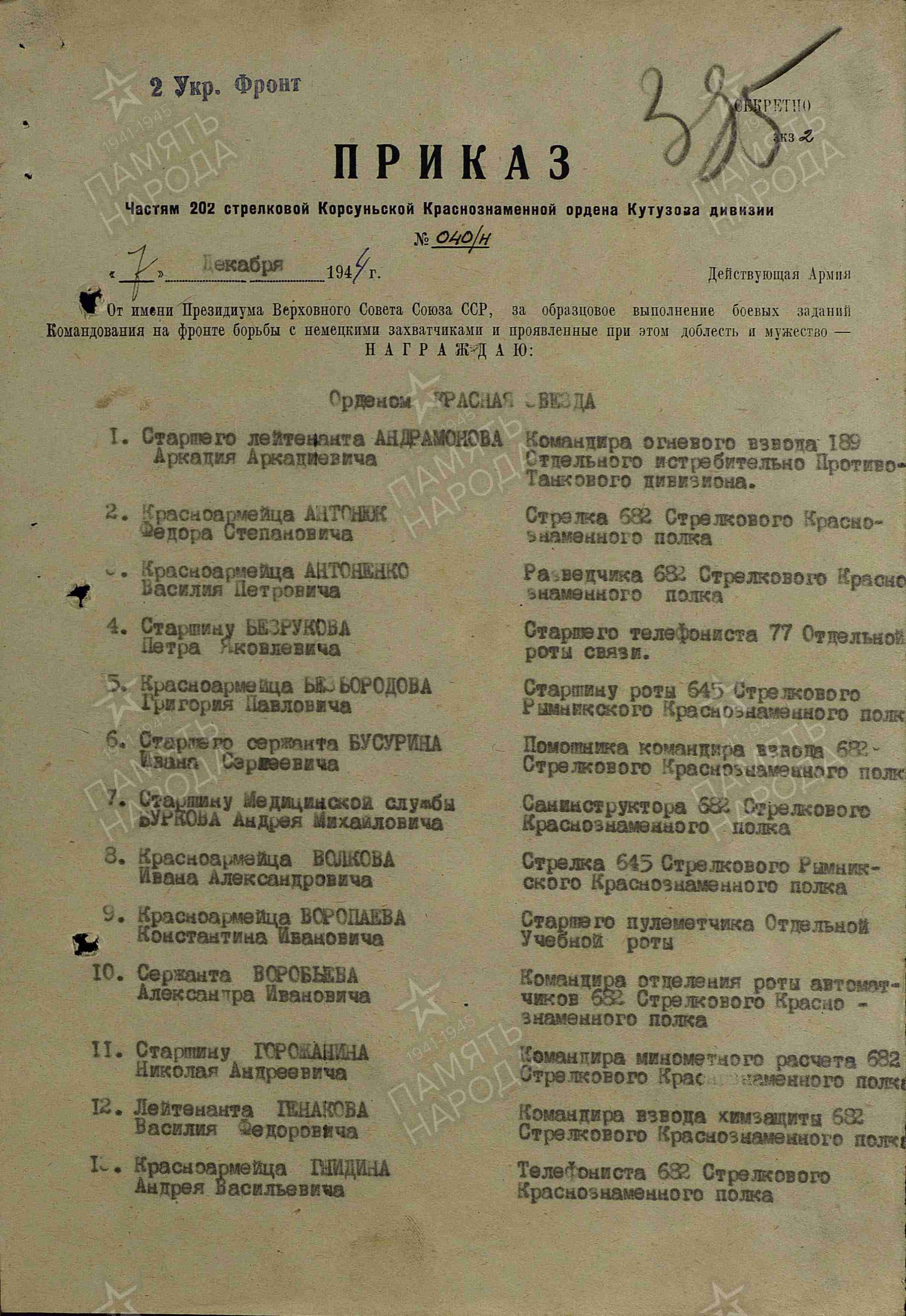 Демобилизован в ноябре 1945 года на основании Указа Президиума Верховного Совета СССР от 25.09.1945 г. Награды в годы Великой Отечественной войны: медаль «За отвагу» (ноябрь 1943 г.), медаль «За отвагу» (май 1944 г.), орден Красной Звезды (декабрь 1944 г.), орден Славы III степени (март 1945 г.).