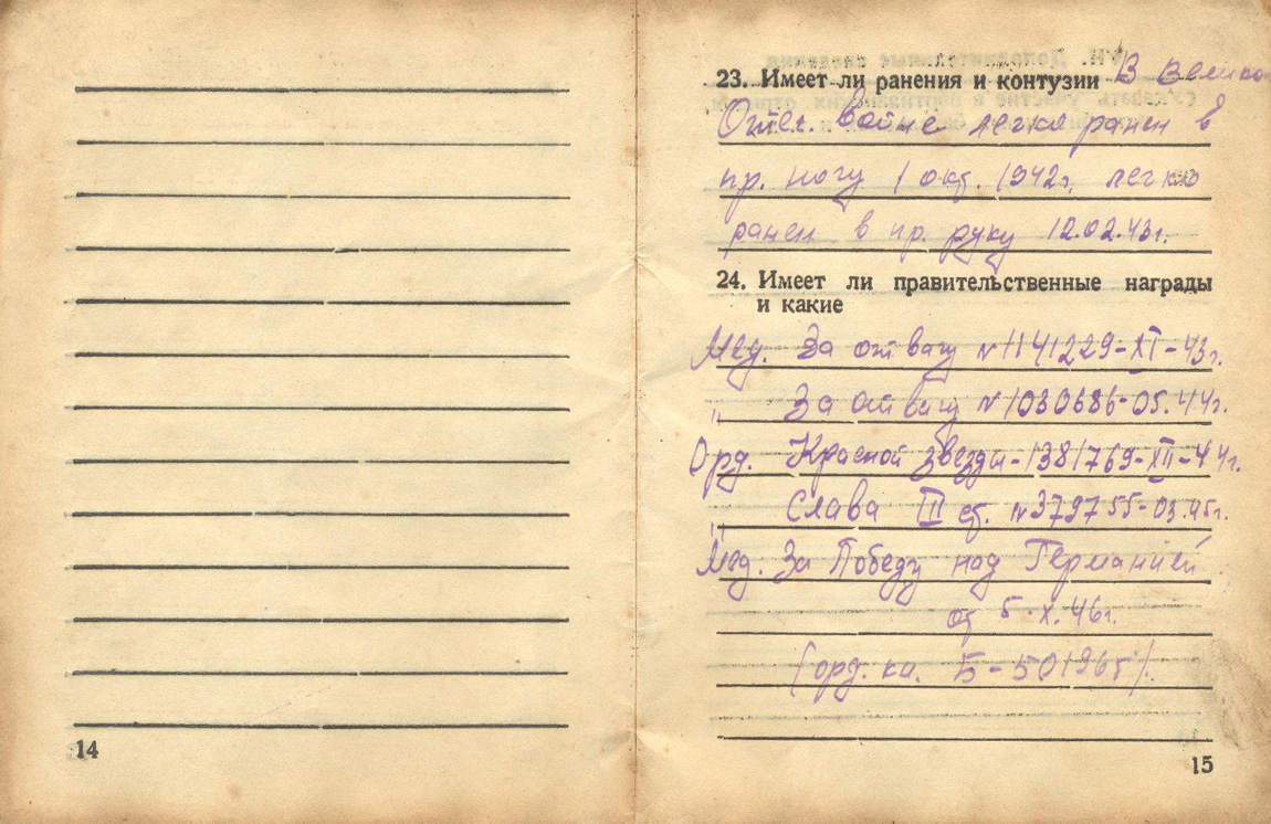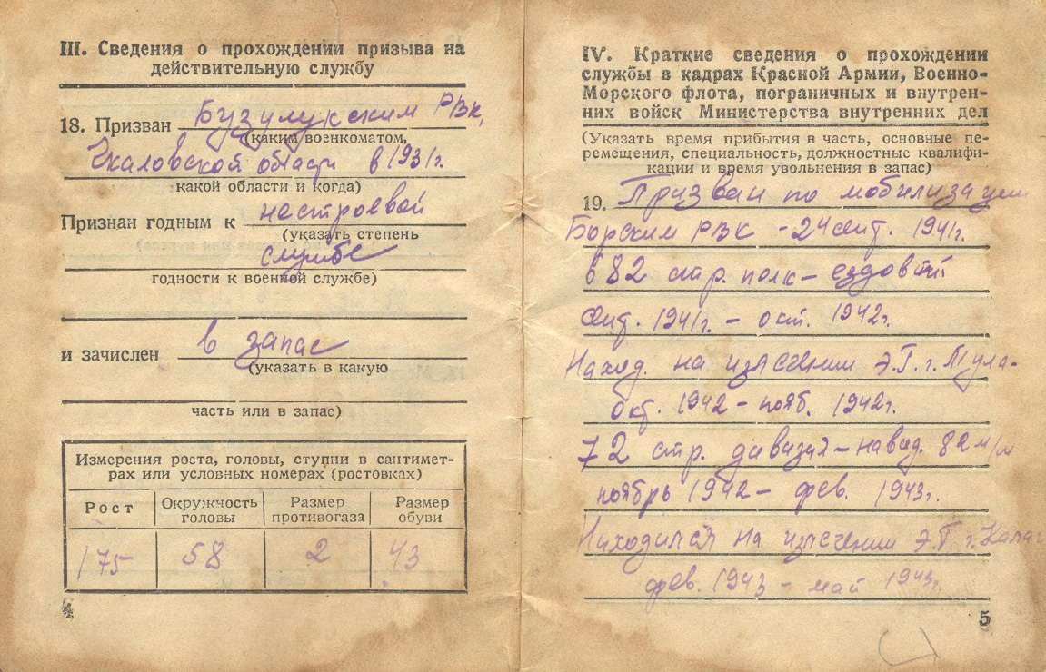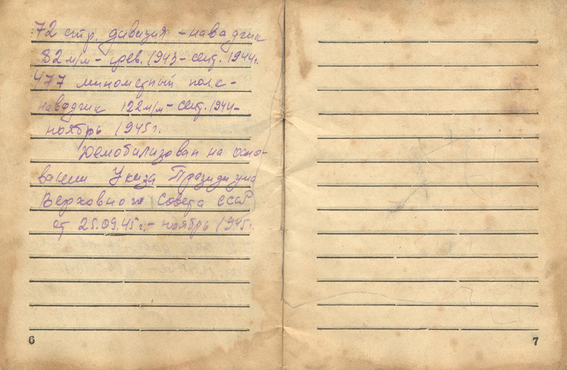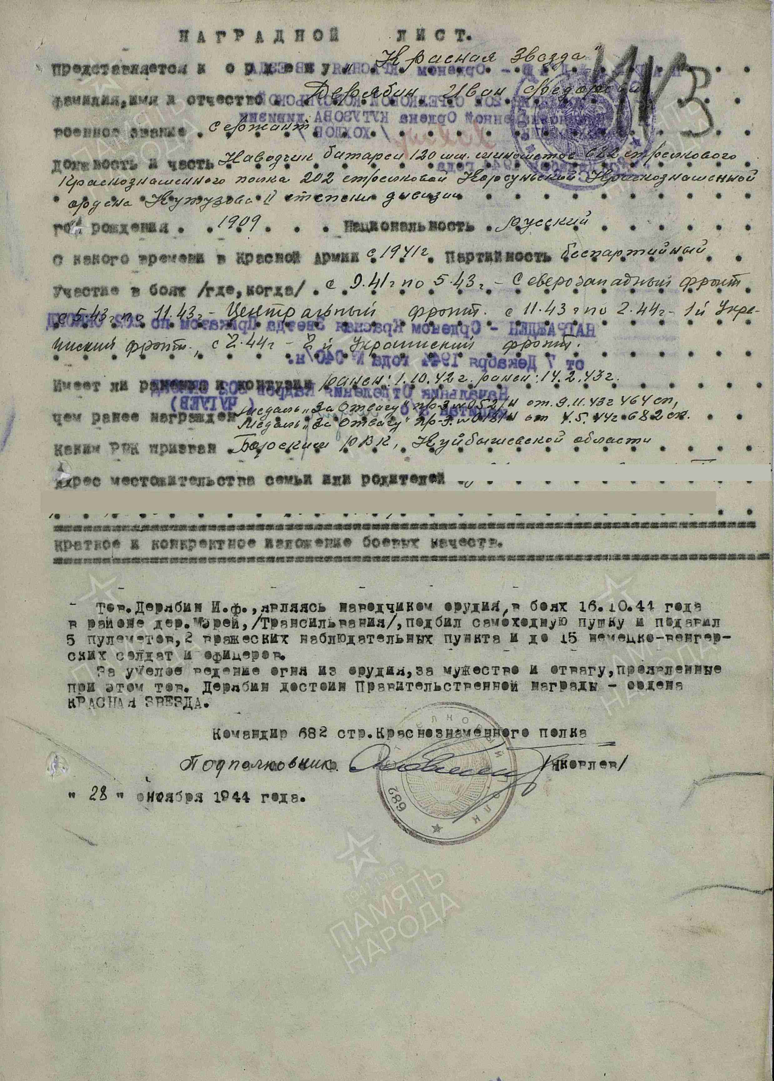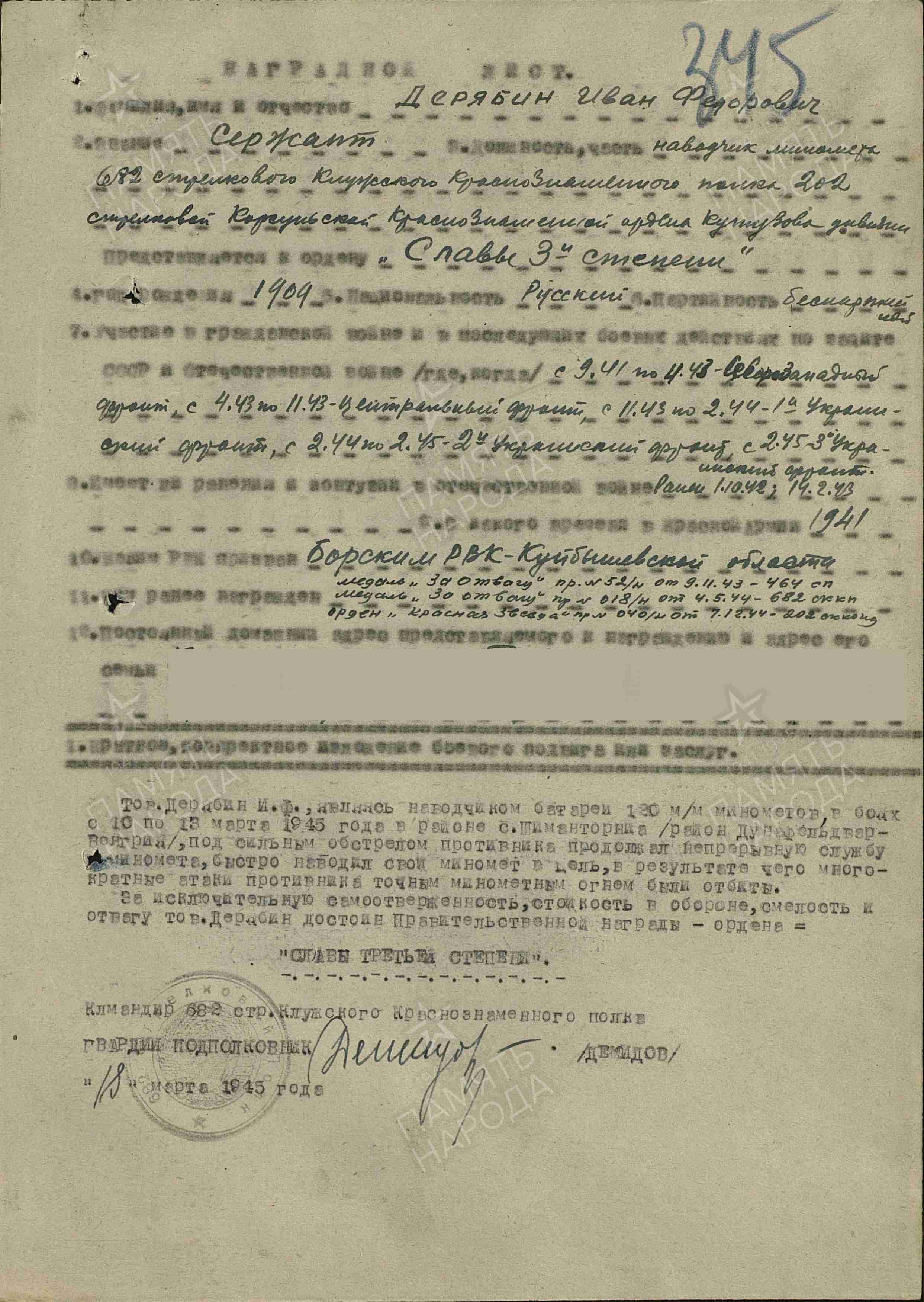 Мной представлен военный билет моего деда – Дерябина Ивана Федоровича, 1909 года рождения. Место рождения – село Коноваловка Борского района Куйбышевской области. На фронт был призван по мобилизации Борским РВК 24 сентября 1941 года. С сентября 1941 года по октябрь 1942 года служил ездовым в 682 стрелковом полку, с ноября 1942 года по сентябрь 1944 года служил наводчиком 82 м/м 72-ой стрелковой дивизии, с сентября 1944 года по ноябрь 1945 года - наводчиком 122 м/м 477 минометного полка. Дважды был ранен, легко – в октябре 1942 года в правую ногу, 12 февраля 1943 года – в правую руку. Находился на излечении в эвакогоспиталях г. Тула, г. Калач.