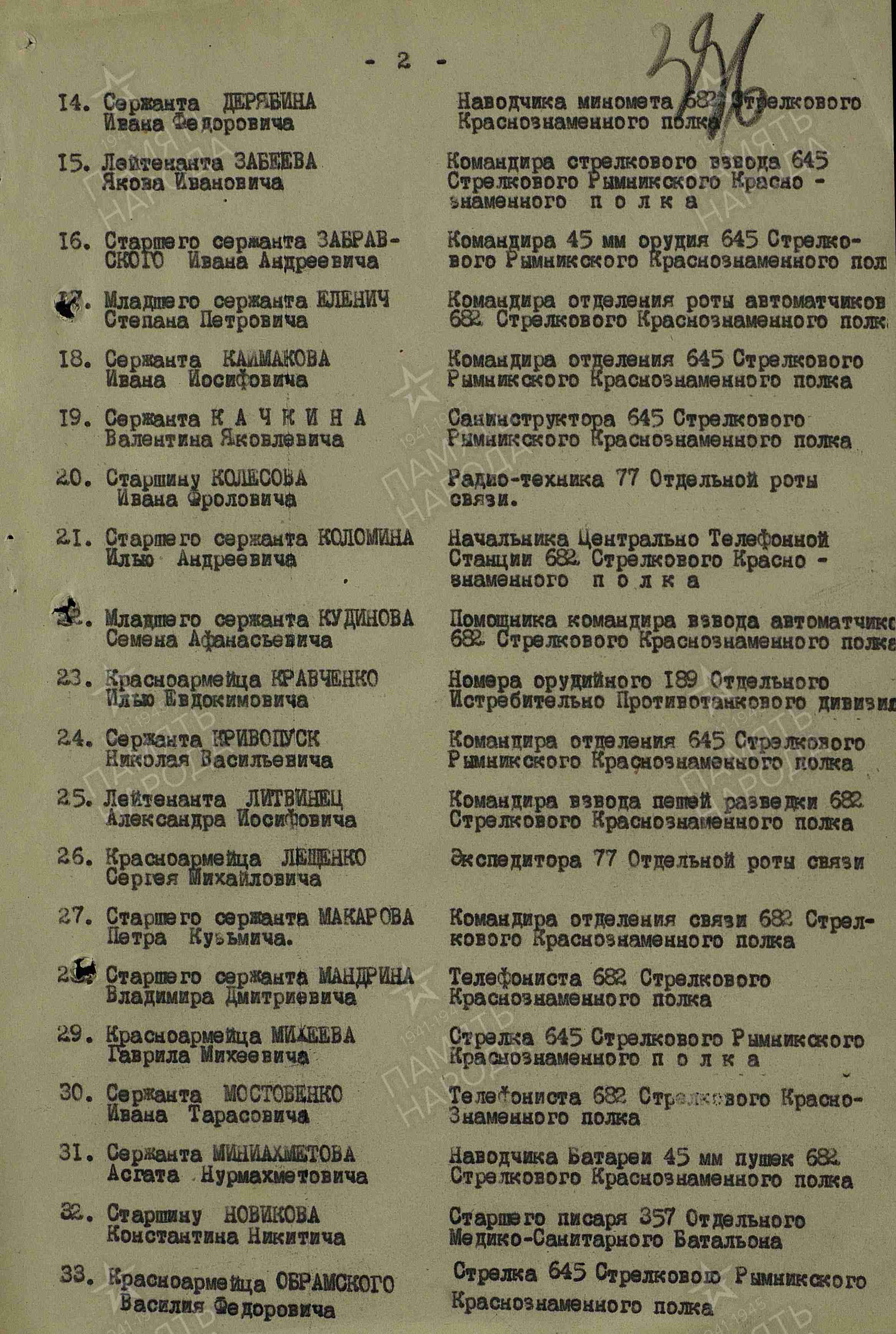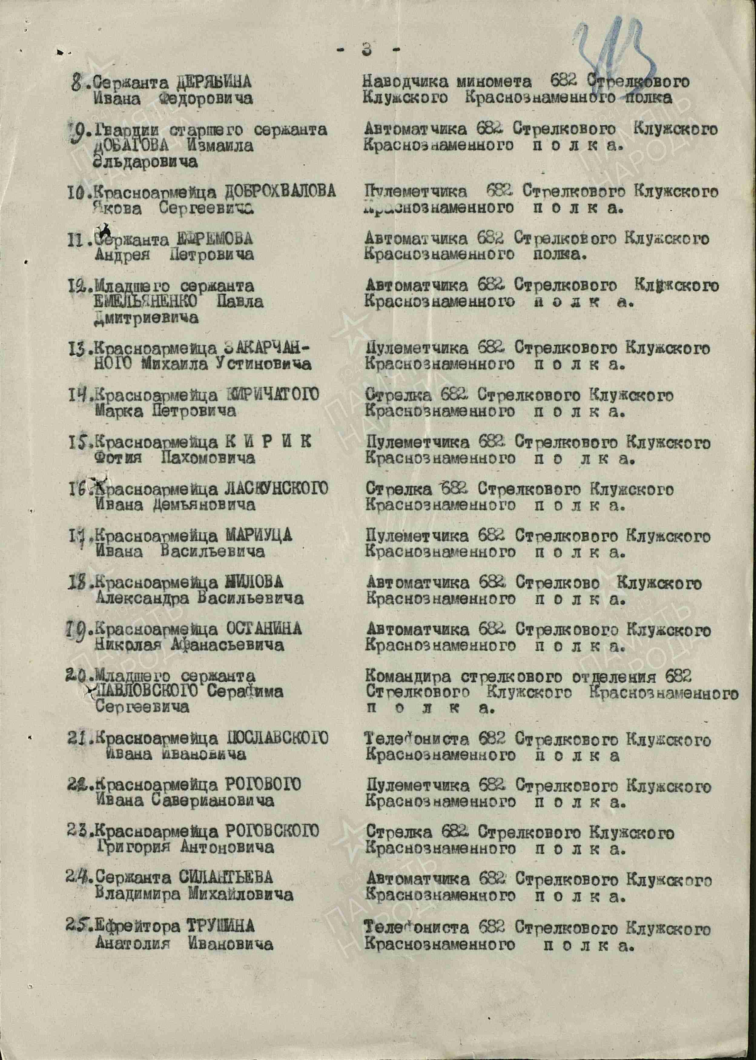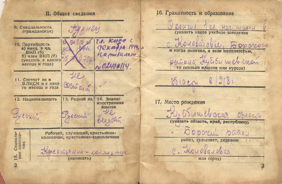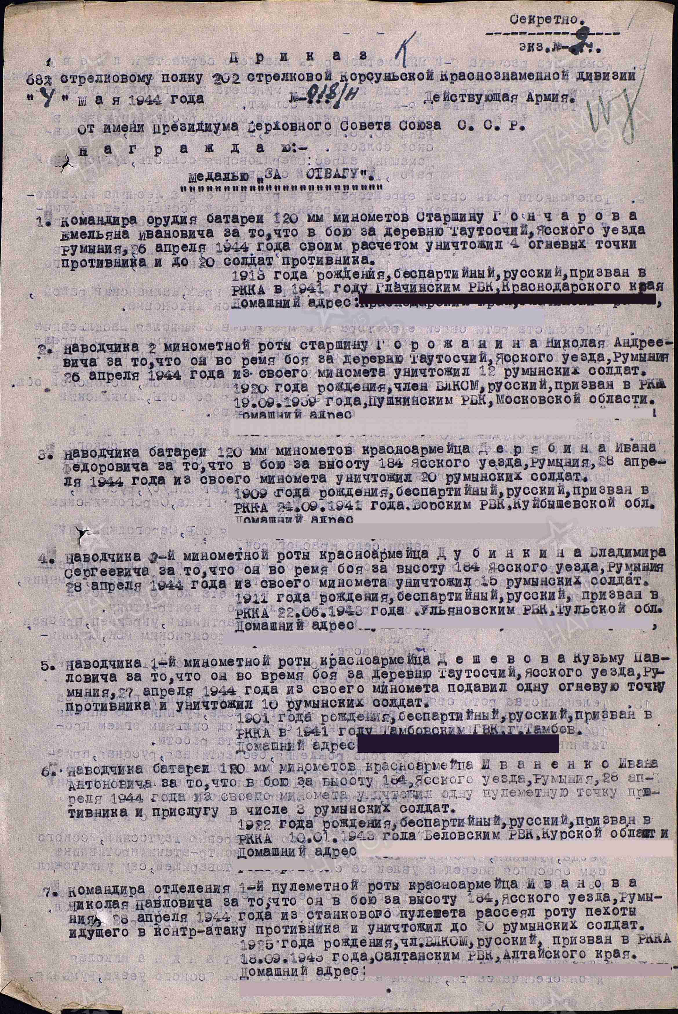 Мной представлен военный билет моего деда – Дерябина Ивана Федоровича, 1909 года рождения. Место рождения – село Коноваловка Борского района Куйбышевской области. На фронт был призван по мобилизации Борским РВК 24 сентября 1941 года. С сентября 1941 года по октябрь 1942 года служил ездовым в 682 стрелковом полку, с ноября 1942 года по сентябрь 1944 года служил наводчиком 82 м/м 72-ой стрелковой дивизии, с сентября 1944 года по ноябрь 1945 года - наводчиком 122 м/м 477 минометного полка. Дважды был ранен, легко – в октябре 1942 года в правую ногу, 12 февраля 1943 года – в правую руку. Находился на излечении в эвакогоспиталях г. Тула, г. Калач.