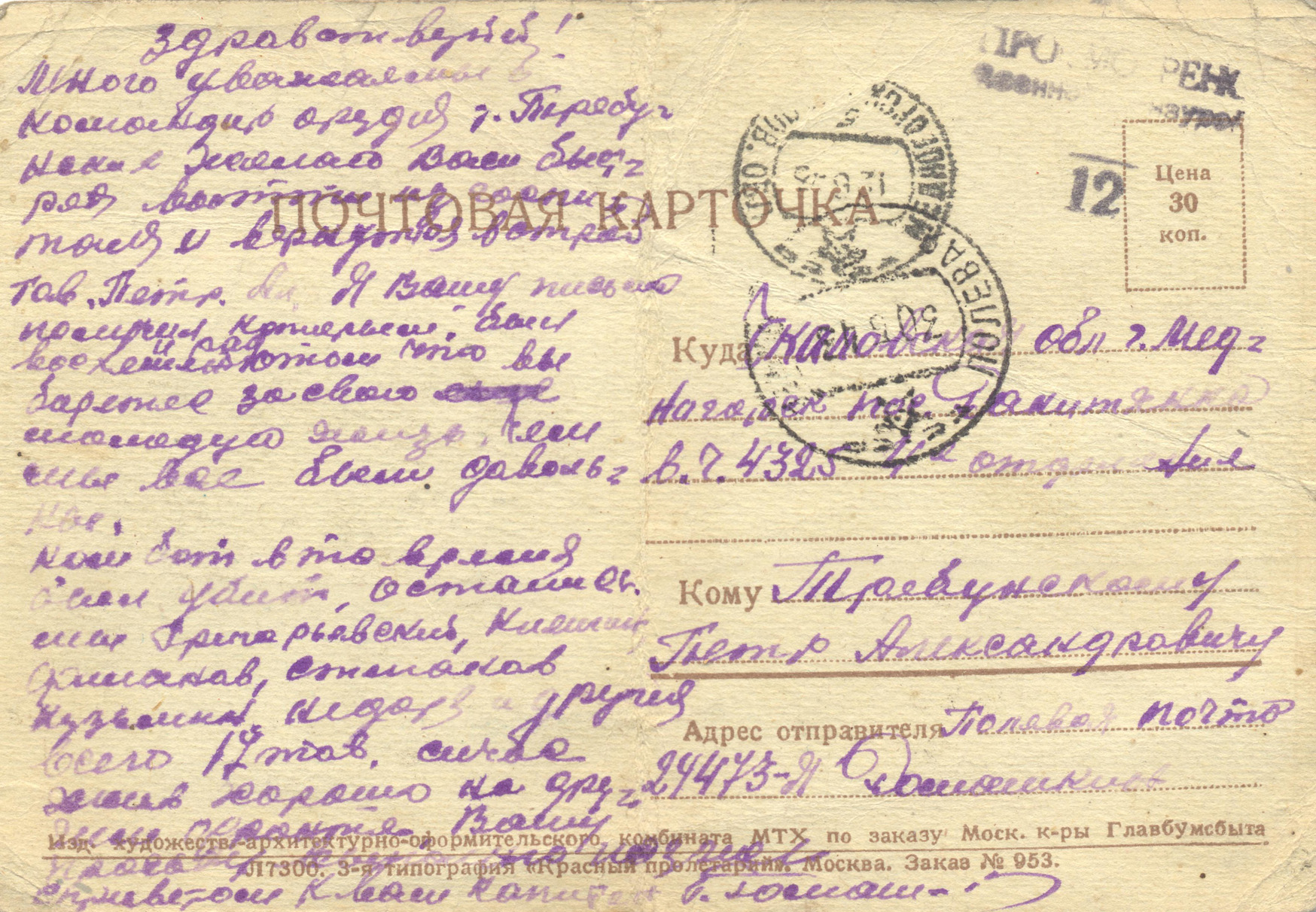 В семейном архиве Требунских сохранилась почтовая открытка, присланная однополчанином Петра Александровича 30 мая 1944 года.