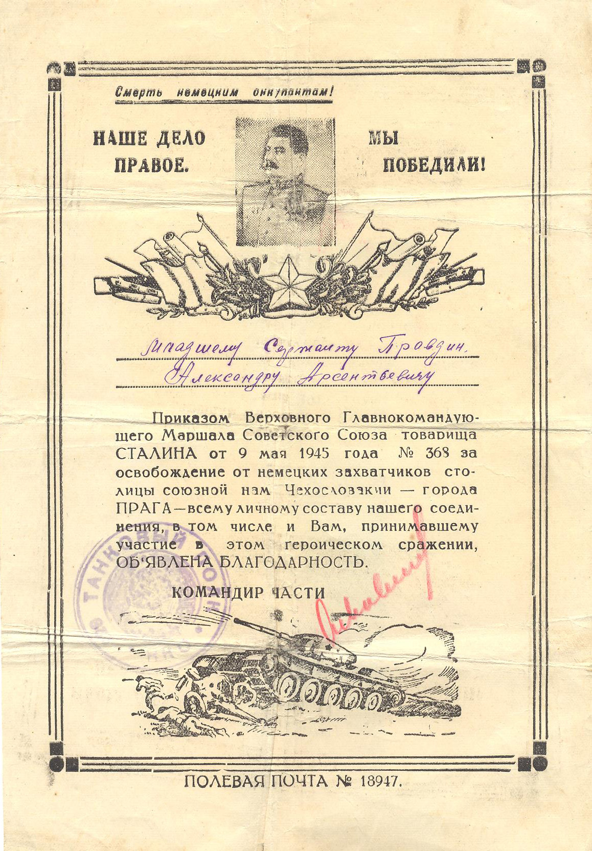 За образцовое выполнение боевых задач во время сражений в Чехословакии, Александр Правдин получил благодарность от советского командования.