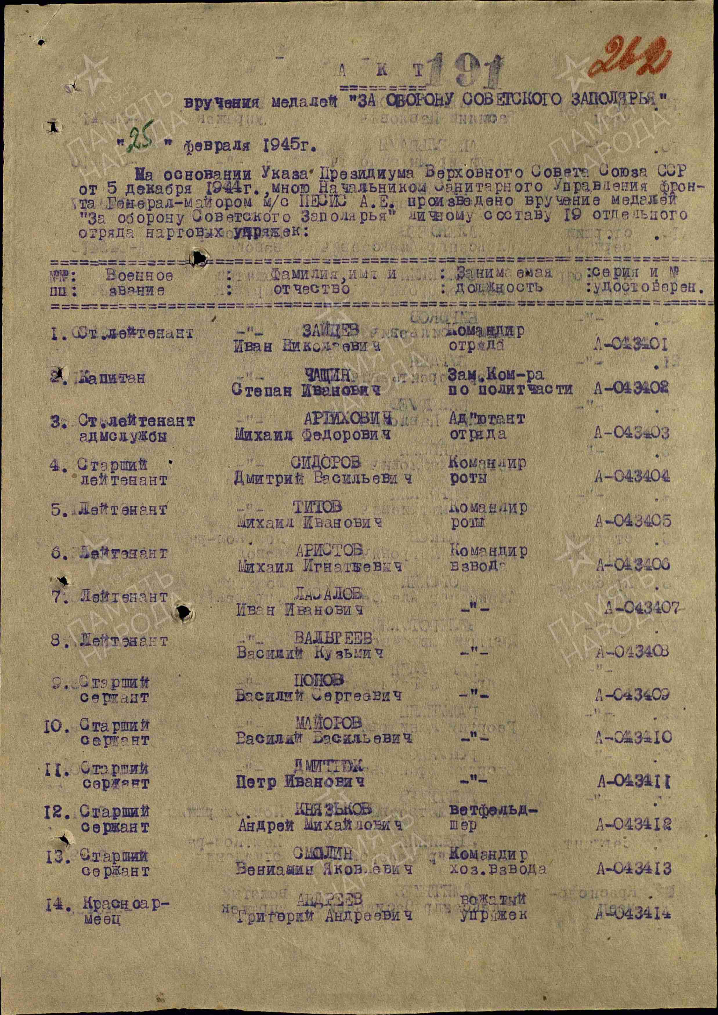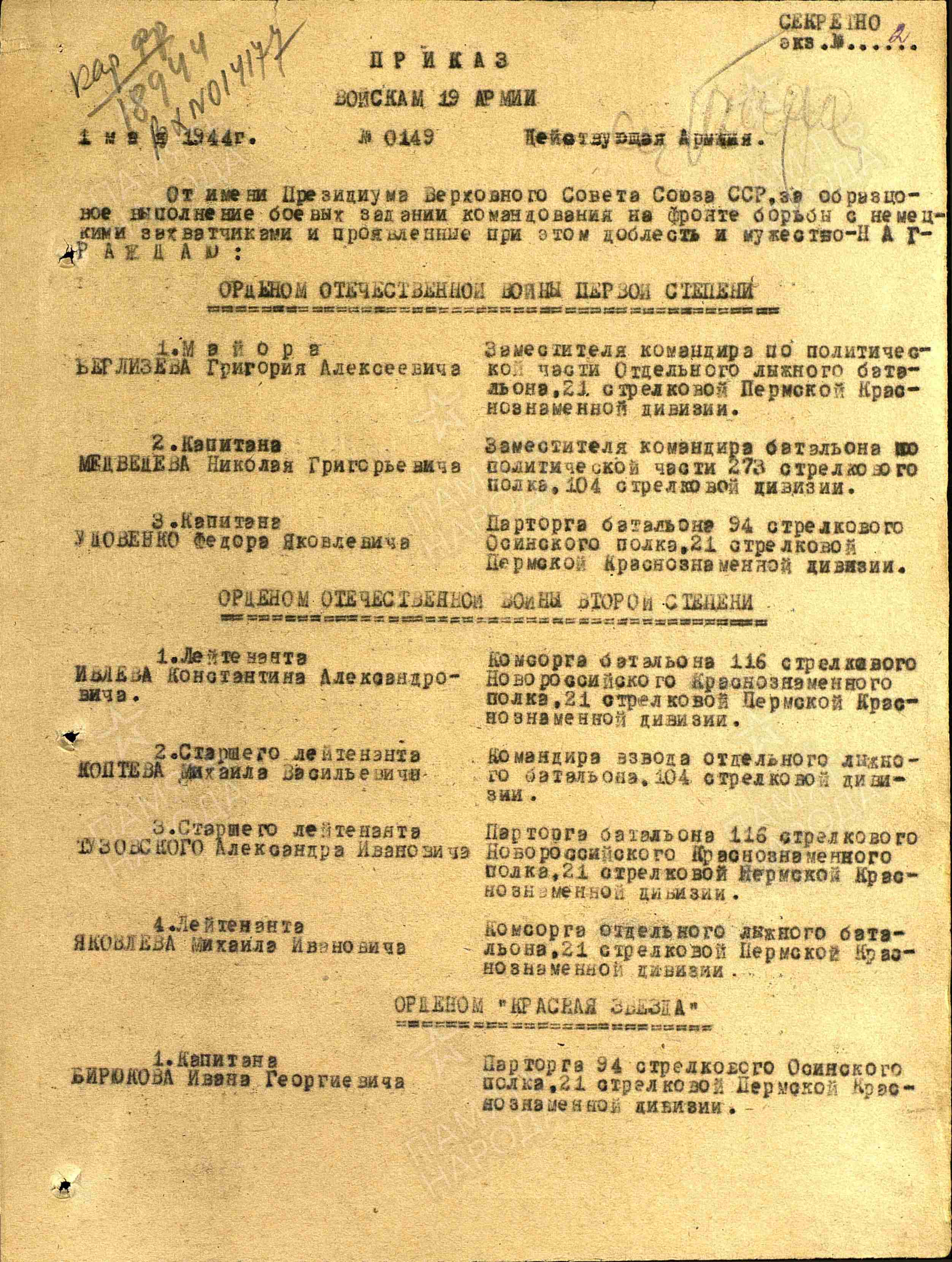 В феврале 1945 г. его наградили медалью «За оборону Советского Заполярья». 22 июля 1987 года дедушка награжден орденом Отечественной войны II степени.