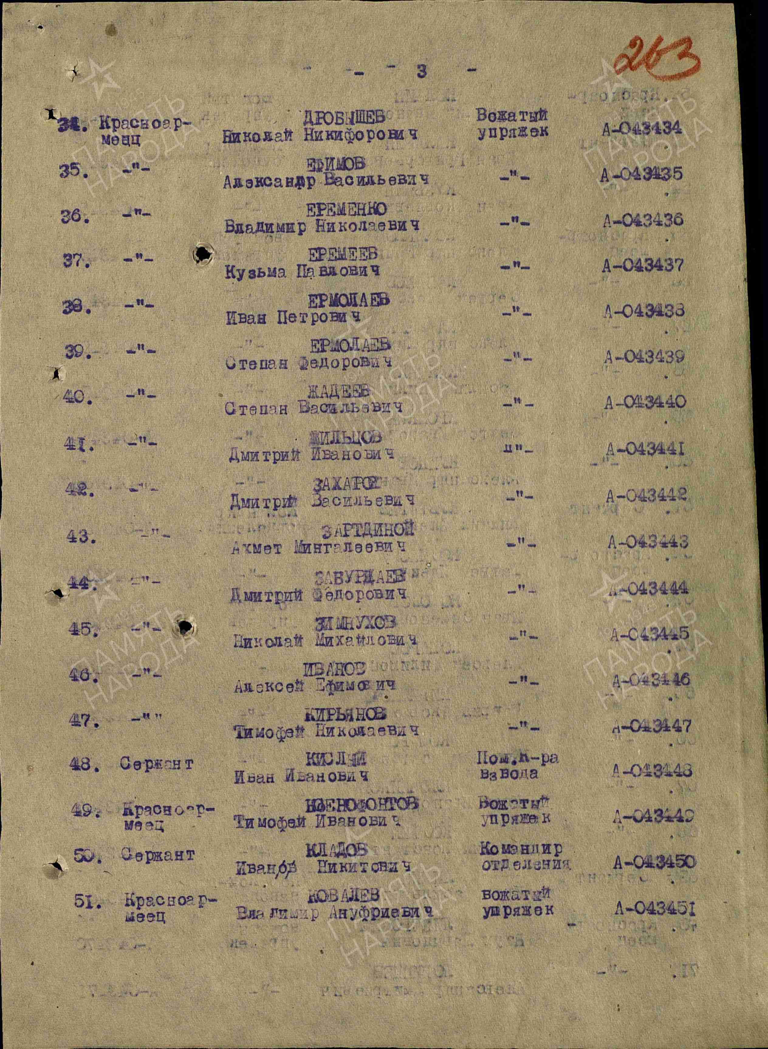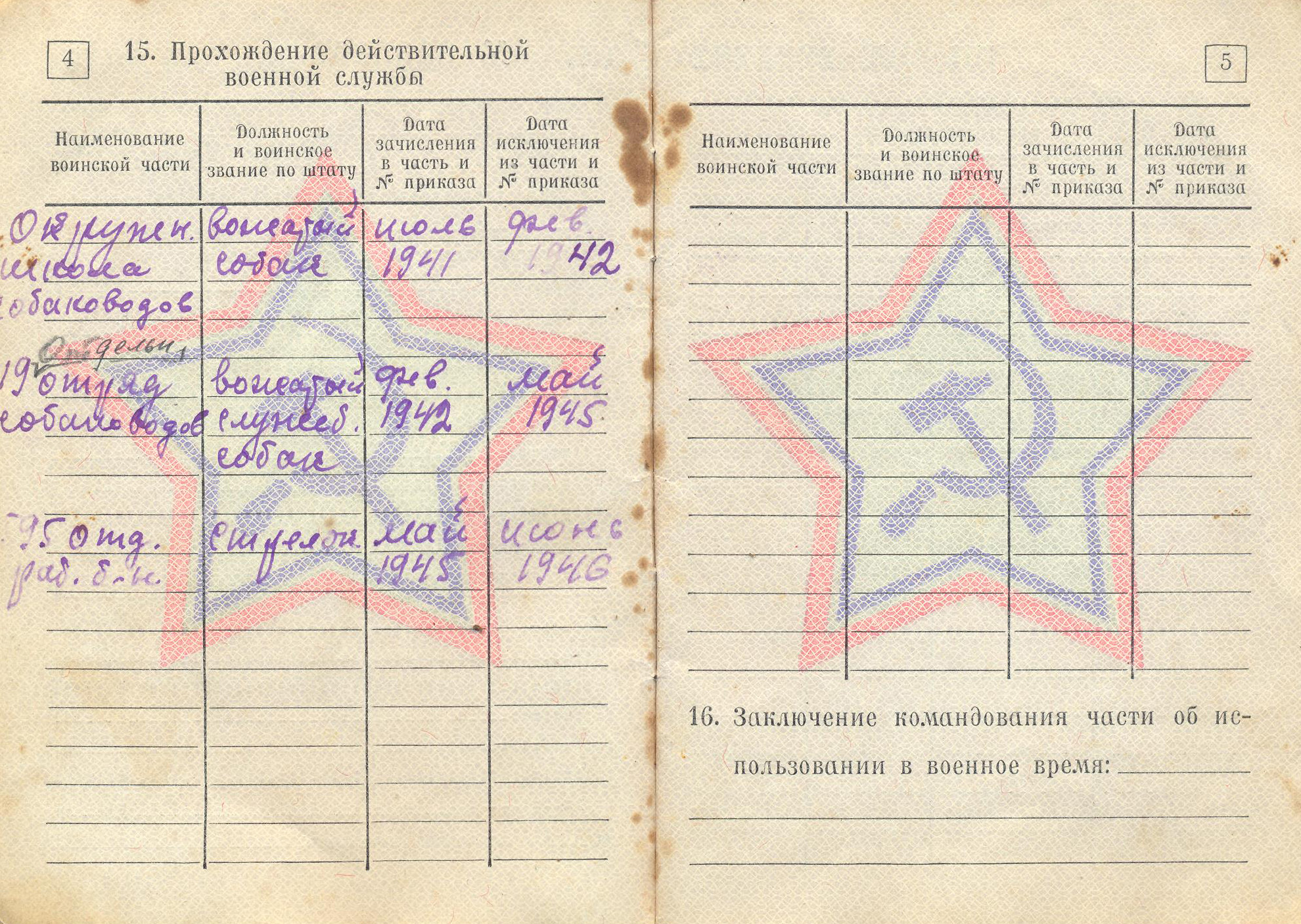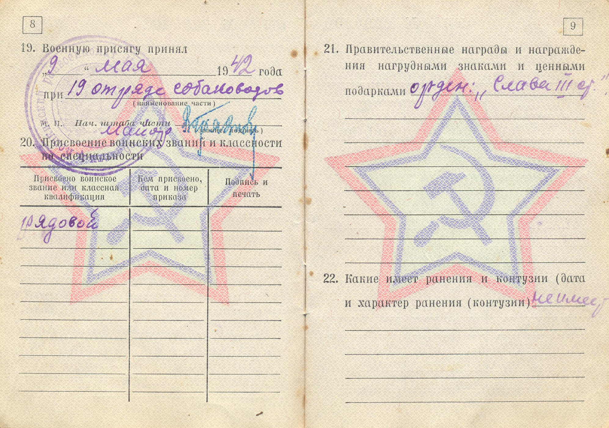 Мой дедушка, Еремеев Кузьма Павлович, родился в 1915 году в с. Малое Максимкино Кошкинского района Куйбышевской области. В РККА призван Кошкинским РВК Куйбышевской области в июле 1941 года. И с июля 1941 года по февраль 1942 года был вожатым собак в Окружной школе собаководов. С марта 1942 года по май 1945 года служил вожатым собак 1 роты 19 армейского отряда нартовых упряжек. Знаю, что мой дедушка 1 мая 1944 года награжден орденом Славы III степени.
