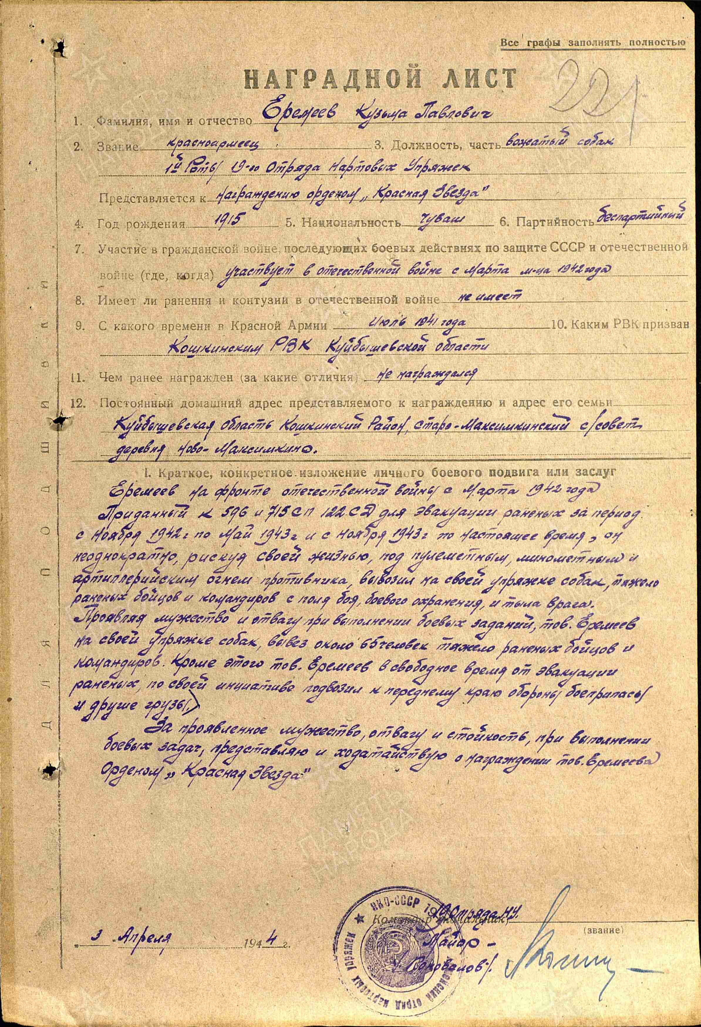 В наградном листе от 3 апреля 1944 г. я прочитала: «…за период с ноября 1942 г. по май 1943 г. и с ноября 1943 г. по настоящее время, Еремеев К.П. неоднократно, рискуя своей жизнью, под пулеметным, минометным и артиллерийским огнем противника вывозил на своей упряжке собак тяжело раненых бойцов и командиров с поля боя, боевого охранения, и тыла врага. Проявляя мужество и отвагу при исполнении боевых заданий, тов. Еремеев на своей упряжке собак вывез около 65 человек тяжелораненых бойцов и командиров. Кроме этого тов. Еремеев в свободное время от эвакуации раненых по своей инициативе подвозил к переднему краю обороны боеприпасы и другие грузы…».