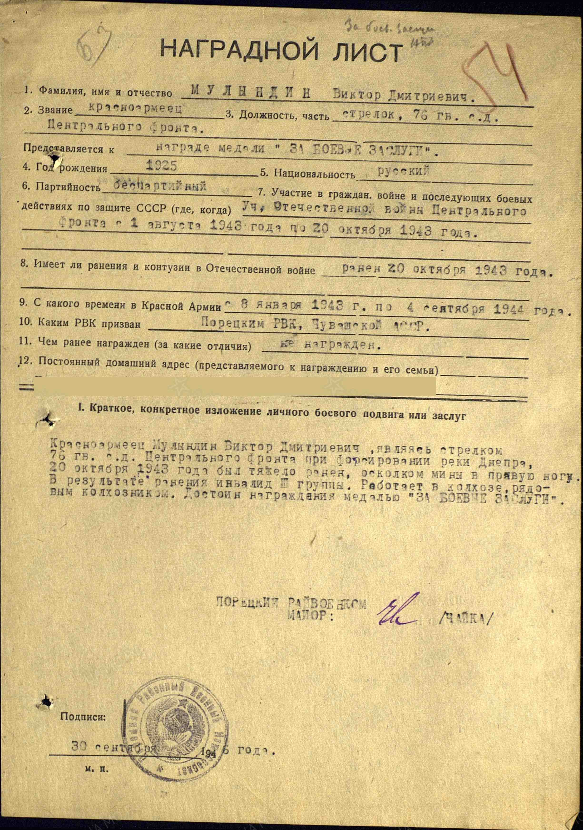 Красноармеец Мулындин Виктор Дмитриевич, являясь стрелком 76-й гвардейской стрелковой дивизии Центрального фронта, при форсировании реки Днепр 20 октября 1943 г. был тяжело ранен осколком мины в правую ногу. В результате ранения инвалид III группы. Работает в колхозе рядовым колхозником. Достоин награждения медалью "За боевые заслуги" (наградной лист от 30.09.1946 г.).